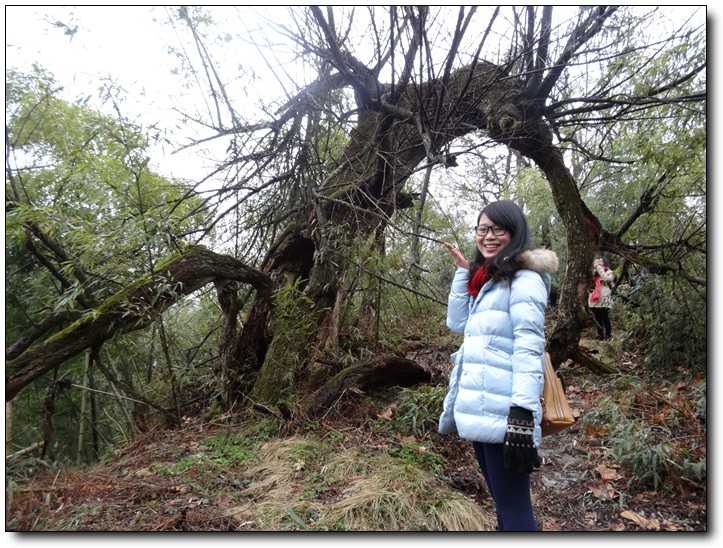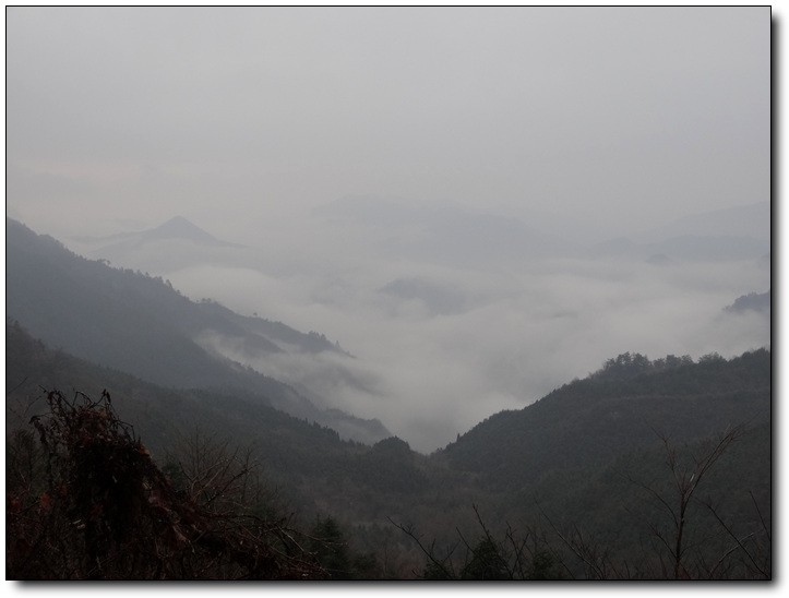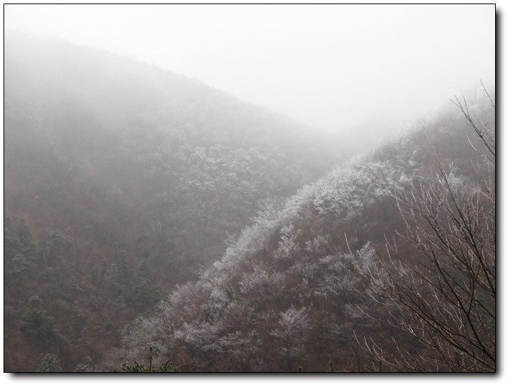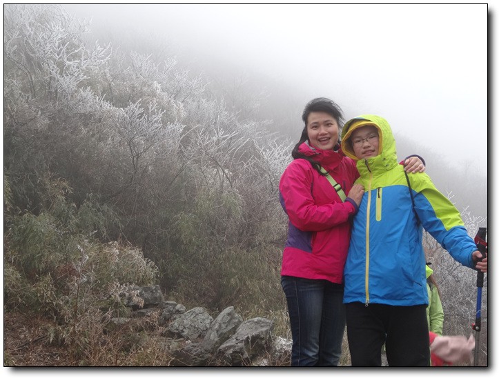 到达山顶关口,风很大,顺风的一侧的树上都结冰了。