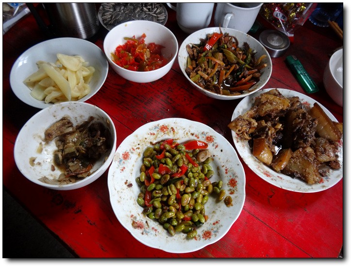 旅程一半,饥肠辘辘。本想稍作休息补充能量,哪想看到队伍中有小孩,热情的村民硬拉我们去家里吃饭。伙食不错呦。。