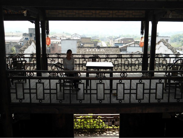 宛如闺秀休闲,悠闲二楼靠前的一方,是一个完全开放的空间,四周皆是围栏,由许多粗壮的柱子支撑屋顶,就像现代建筑中的带顶棚的露台。这里摆放着好几套木桌竹椅,供游人喝茶聊天,休闲味十足。坐在栏边,能将整个尧坝镇尽收眼底,而极目之处,远山在蓝色的天幕下被染成了黛青色的剪影。这种居高临下的感觉,会令人豪气顿生,果然是武进士的宅第!