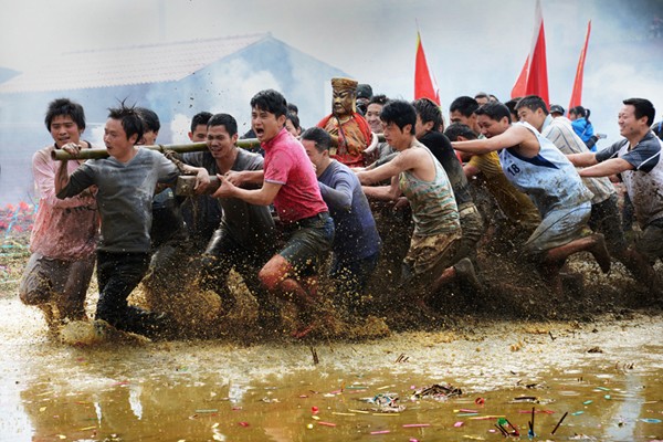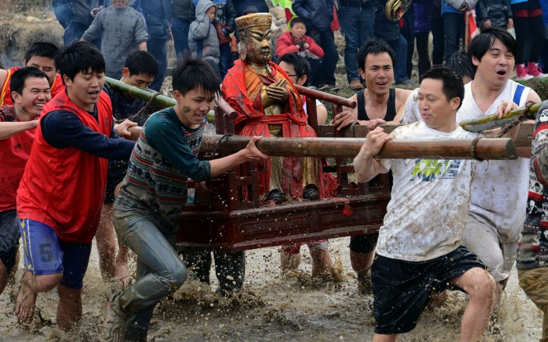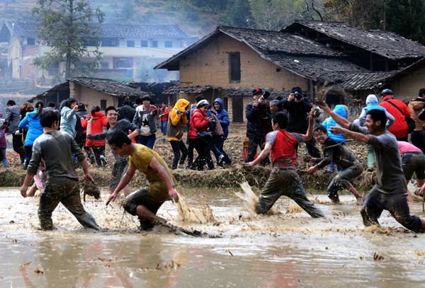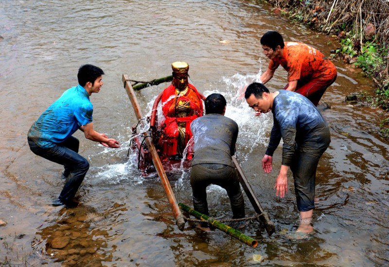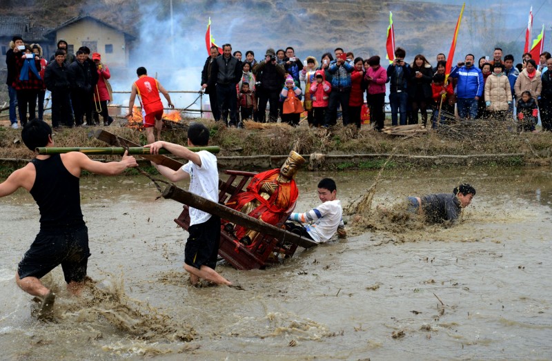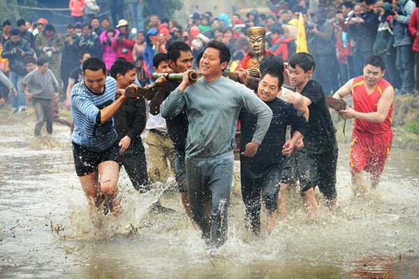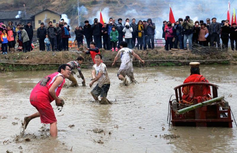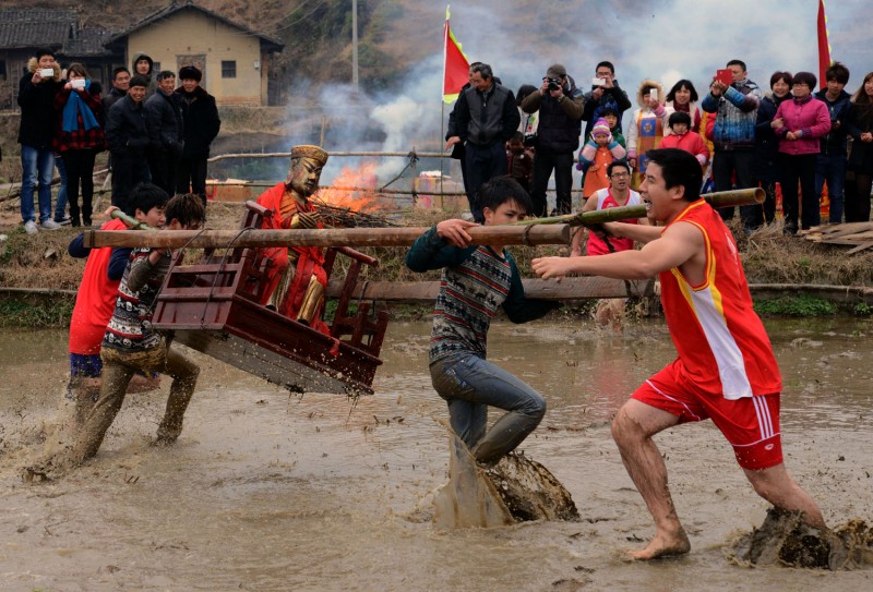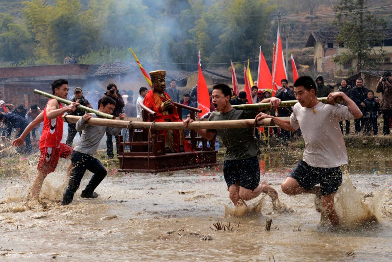“闹春田”是长汀县童坊镇的客家人迎接关公,敬奉关公的民俗活动。这天,他们在童男童女组成的彩旗队带领下,敲锣打鼓地把关公像抬到各家供祭拜,每家都在门口设香案,摆果茶,有的还杀公鸡,烧纸钱,以鞭炮相迎。仪式过后抬到田里,以祈求来年风调雨顺,五谷丰登。村里的青壮年,四人一组,抬着“关公”神像,在上一年收成最好的水田里不停打转,摔倒了再换上四个人上。高潮时,众人抬起神像,在田里狂奔。田边站满了人,吆喝助阵,在彩旗、鞭炮声的衬托下显得格外热闹。末了“抬夫们”还从田里抓起泥团,相互扔掷、嬉戏,以图热闹喜庆。