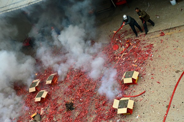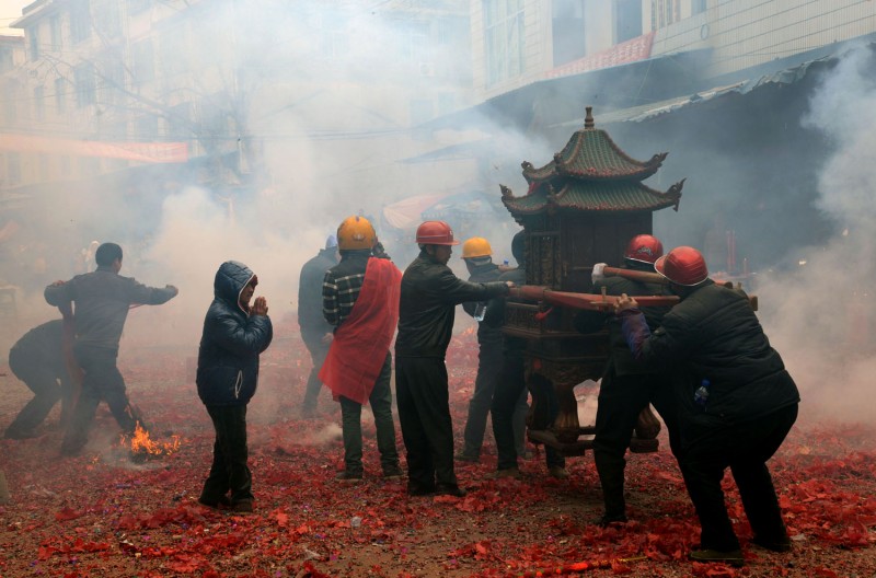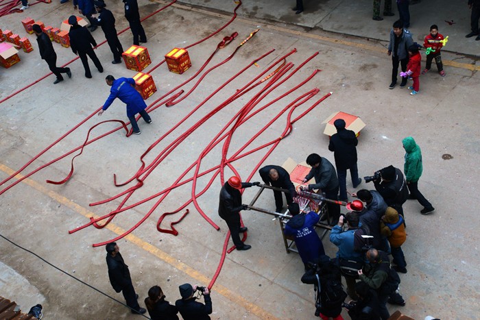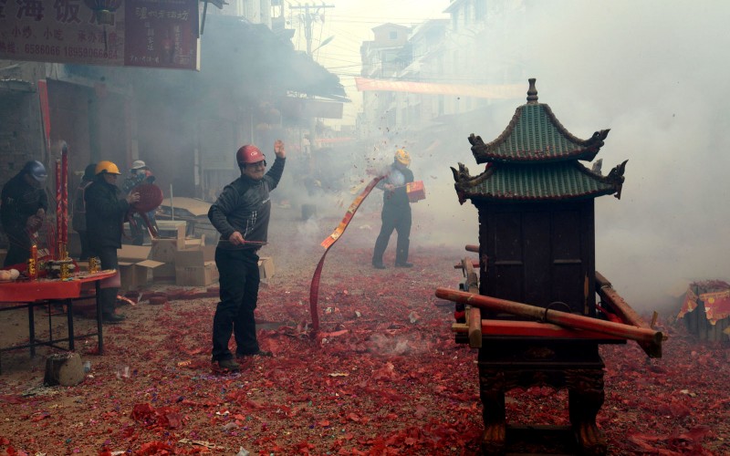 涂坊过十三,最绝的是鞭炮。真是见过放鞭炮的,但没见过放那么多鞭炮的。镇上的大街有百米来长,街两边的商铺,搬成箱的鞭炮到路边,一盘盘万响鞭炮,像甩消防水带似的甩到街的那边,一条接着一条甩,铺满整个街面。四名抬夫抬着三佛祖师过来,商家就点炮,迫使三佛祖师在他家门口停留,他们相信停留的时间越长越发。一家刚停,一家又起,此起彼伏,震耳欲聋。