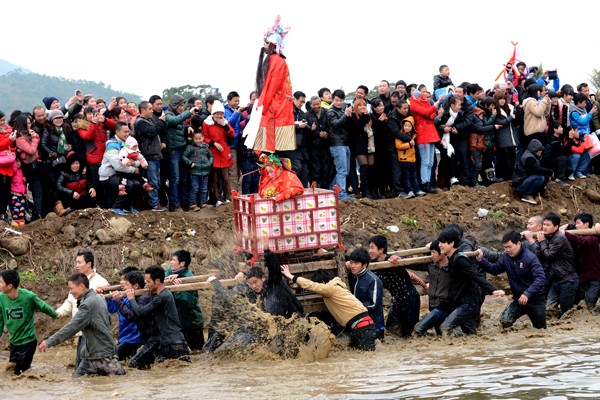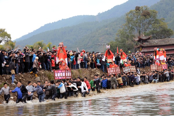 古事棚逆水而上,除天官一棚不能超越外,后棚若能超过前棚,则视为吉利。于是抬夫们拼力而为,不顾天寒水深,河石苔滑,跌倒了再爬起来,勇往直前,情绪异常高昂。