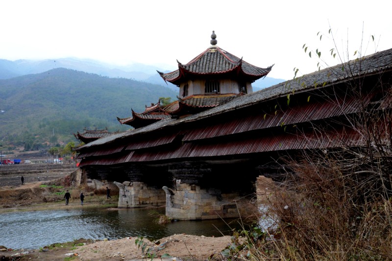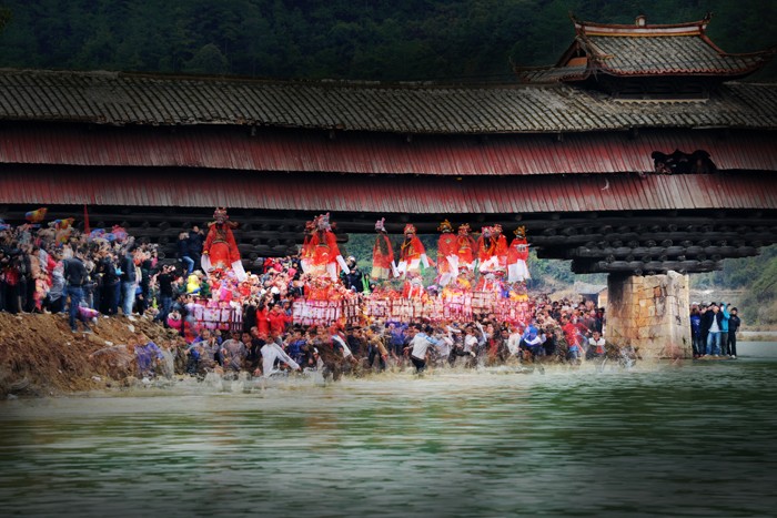 抬着古事棚在水里面赛跑,是走古事的最后一个竞赛项目,也是最精彩最激烈的项目。为了一个理想的机位,拍摄水中古事,我放弃了陆地追逐,提前2个小时占据了河滩。不一会河滩上布满长枪短炮,河的两岸也站满观众,临近开始时,简直就是里三层外三层了。由于两岸都没有护栏,时不时有人掉水,传来一阵惊叫。下午1时许,七棚古事在屋背山坪跑完之后,列队从“云龙桥”下走到河床。三声神铳响起,几百号人抬着古事往刺骨的河水中奔去。顿时,河岸两边吆喝声、呼喊声连成一片,此起彼伏,不断有人因冲撞而跌倒,爬起来再向前冲去,泥土、河水溅湿了岸边的人群。