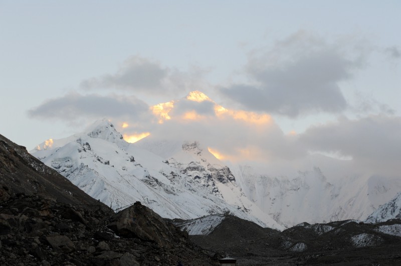 到达珠峰大本营宿营地时天色已暗,只剩一点余晖洒在珠峰顶上。