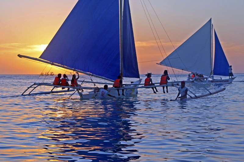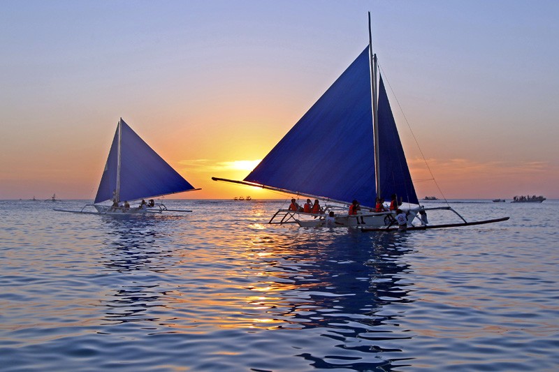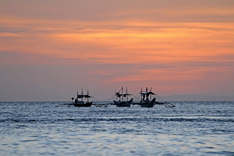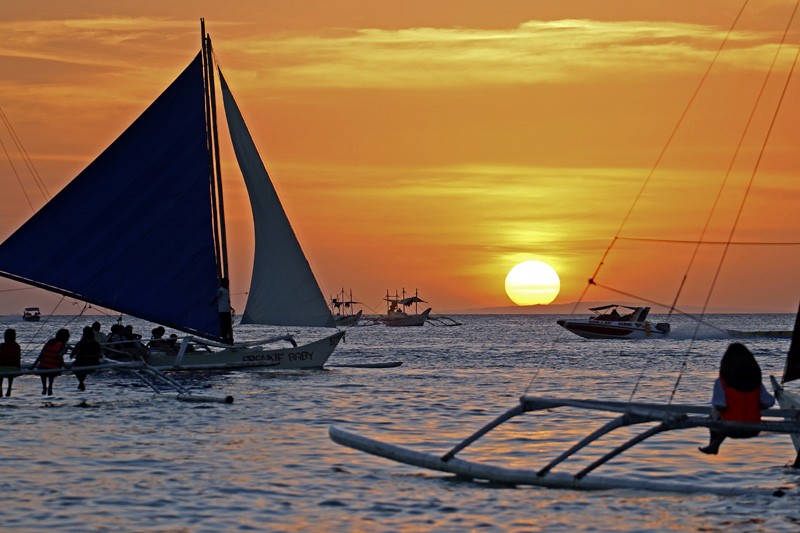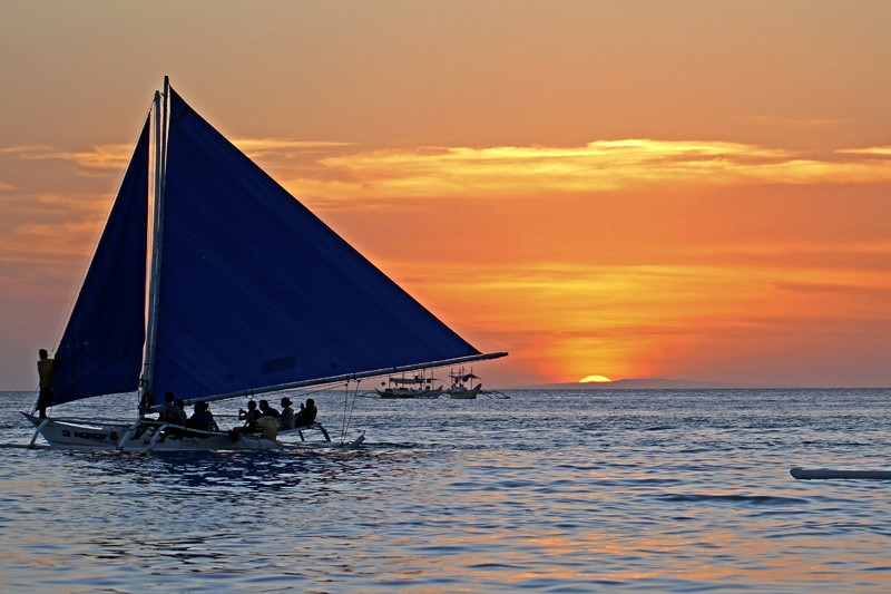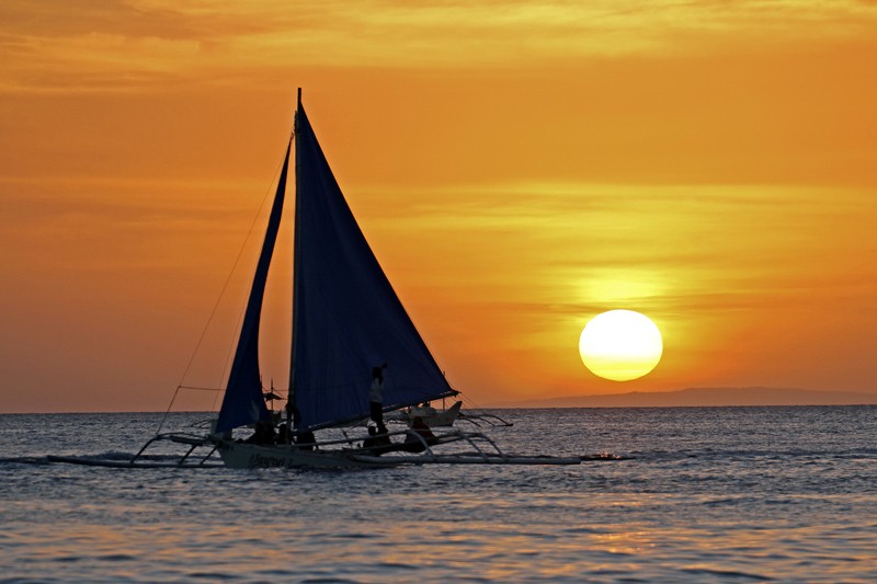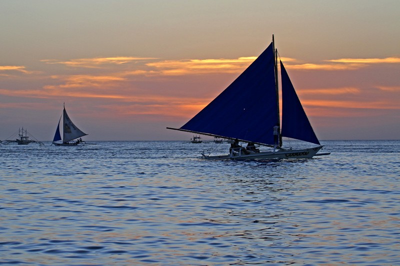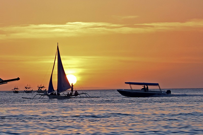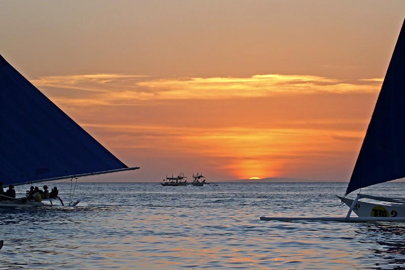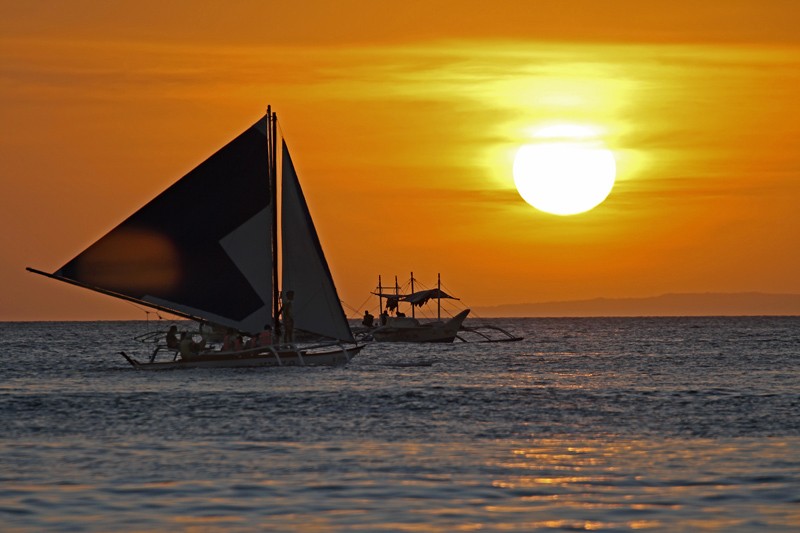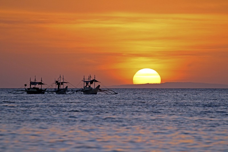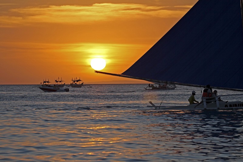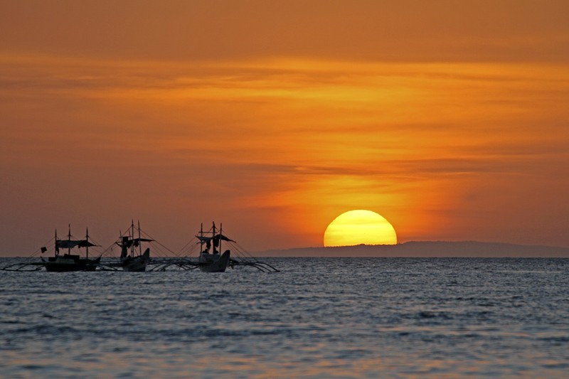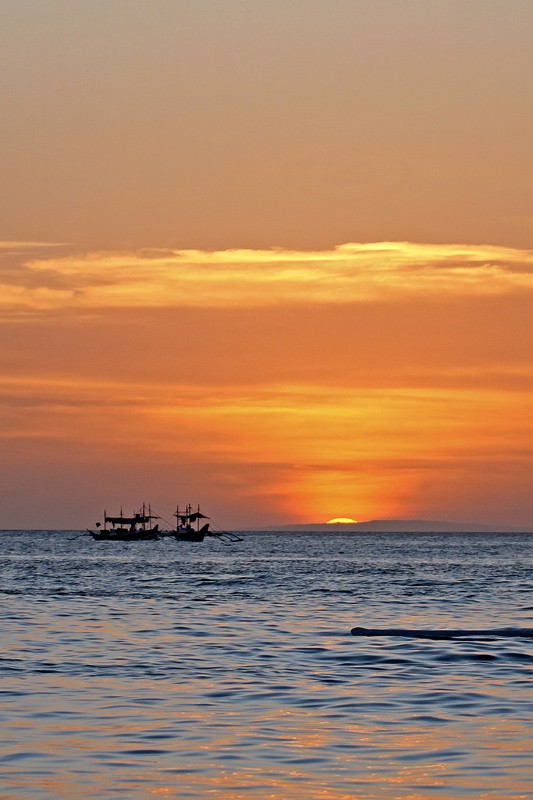 长滩的日落是世界上最美的美景之一,日落因为有了风帆的衬托更显生动。在长滩岛的几天,天天在海边看日落,最后一天终于看到了落日美景,那天近黄昏的太阳在云层中闪出金光,一点点溅落海面的太阳,在金黄色的云层中突现浑圆,瞬时海天都披上一层金黄,海面上的风帆与落日余辉相映,那种落日熔金的美景实在让人迷醉... ,真感叹大自然的恩赐,给与人类如此美的画面,我只有不断释放快门纪录美好景色。