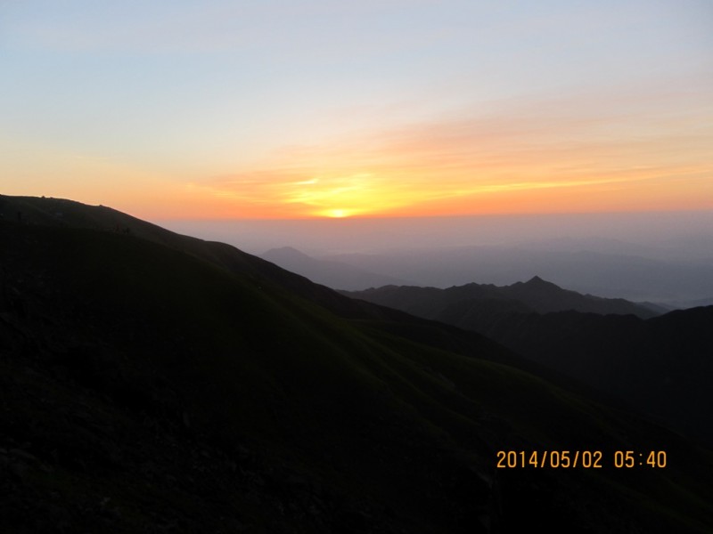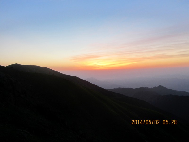 第三天5月2日,起了一大早,看武功山的日出。带着一颗虔诚的心,静静的注视着远方的地坪线。启明已高高的挂在上空,早霞一片片地被染红,太阳一点一点地露出他的真容,而后又躲进云层后,映红了半边天空。在太阳出现的那一刻,有个响亮的声音在呼唤“太阳你好!”。我爱你太阳!万物生灵之神,是你带来了无限的生机活力,点亮了人们心中的希望。