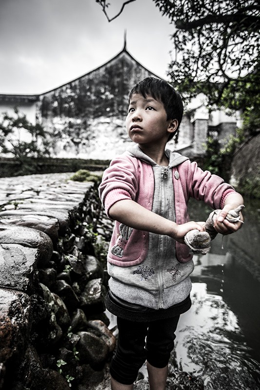 丽水老街的一名洗衣服小女孩,我们到达丽水街的时间约为早上7点半左右,冒着小雨和湿滑的石板路,小孩子已经在河边洗衣服和鞋子了,实在不忍心打扰她,趁凌云老师跟他说话的时间,拍了一张
