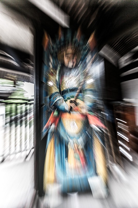 浙江一带的村落都带有祠堂,大门上都有面目狰狞的门神彩绘,色彩夸张,可比唐彩,尝试了下旋焦拍摄