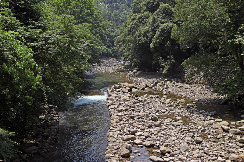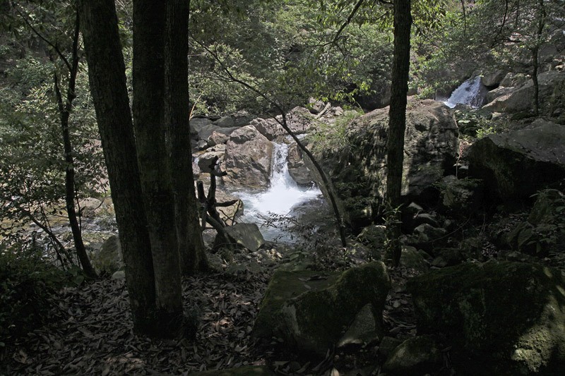 游船靠岸进入葫芦湾后,进入峡谷溪水潺潺,沿蜿蜒山路前行约千米,就可见一处陡峭光滑的石壁上,一帘高近百米、宽有十米的巨大瀑布飞泻直下,扬扬洒洒跌入深潭。因瀑顶崖面上有上下相连、形如葫芦的两个大洞,瀑水经此“葫芦”喷薄而出,故名“葫芦瀑布”,是“新安十景”之一。