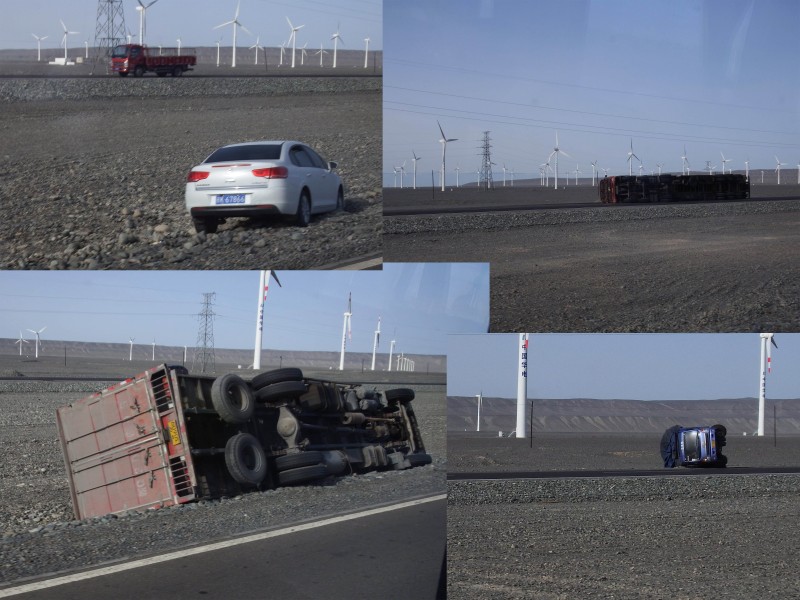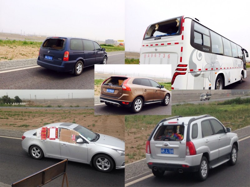 5月31日本是这次环天山游的最后一天,意想不到的是,因九级以上大风,我们被挡在了“吐鲁番高速收费站”,不让通行。在等待高速开通的时候,我们看到从乌鲁木齐开过来的大小车辆都是伤痕累累。