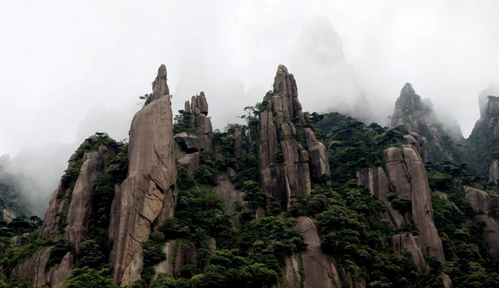 ★三清山——三清山位于江西省上饶市玉山、德兴两县交界处。三清山主峰玉京峰海拔1819.9米,三清山因山有三峰,名为玉京、玉华、玉虚,如三清(即玉清、上清、太清)列坐其巅,故名三清山。三清山南北狭长,约56平方公里,由于长期地貌变化,形成了三清山别具一格的奇峰怪石、急流飞瀑、峡谷幽云等雄伟景观。是著名的道教名山。