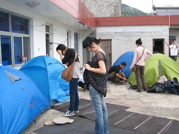 我们8:00不到出发,原本预计会下午5、6点到达目的地三沙镇,结果感谢司机的专业技术,我们3点半就到了。按计划一部分队员住宿,一部分扎营。但是貌似是碰上了海风 台风,原本是要到堤坝上去扎营的,结果旅店老板让我们扎营在了他家的天台。这真是个好地方啊,可惜风还是很大,大家尝试了很多次,最后终于“铁索连舟”尽量不让风吹起来。不过据说那天晚上风越来越大,很多人都因为风声搅得睡不好。