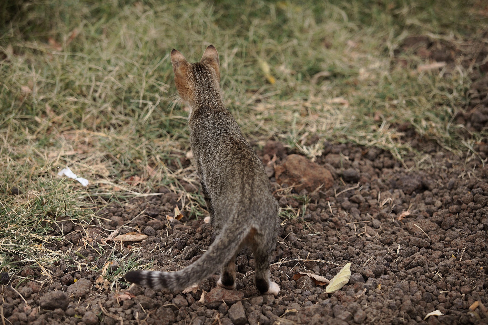这是一只灰色条纹,身形瘦削的小猫,除了体型比我们小区里的流浪猫瘦小外,别无引人注目之处。因为等待中百无聊赖,抱着一颗观察动物的心,想看看非洲猫与中国猫有啥不同,我走近前去看它,这一注意,还真发现了大不同。