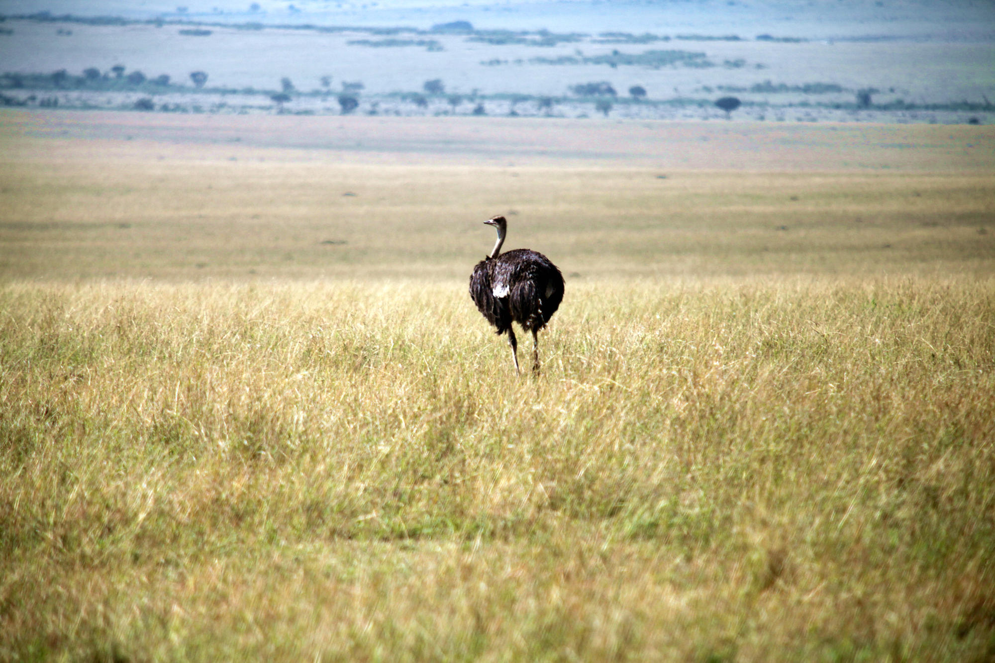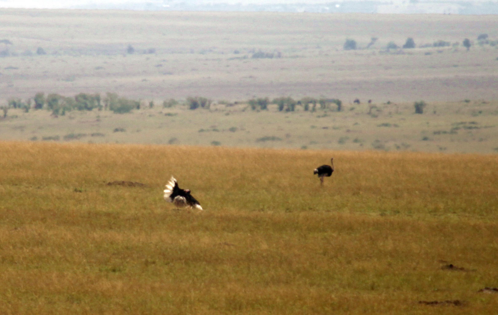 在马赛马拉,看到鸵鸟的频率不算低也不算高,所以当Steve看到远处有一只鸵鸟爸爸而停车时,我们并不兴奋,也不认为他会停很久。然而,过了一会儿,他却熄掉了引擎。正当我们颇感纳闷时,他露出一如既往的憨厚微笑指向远处:“Look! Another Papa! Let’s wait to see if they will fight.”