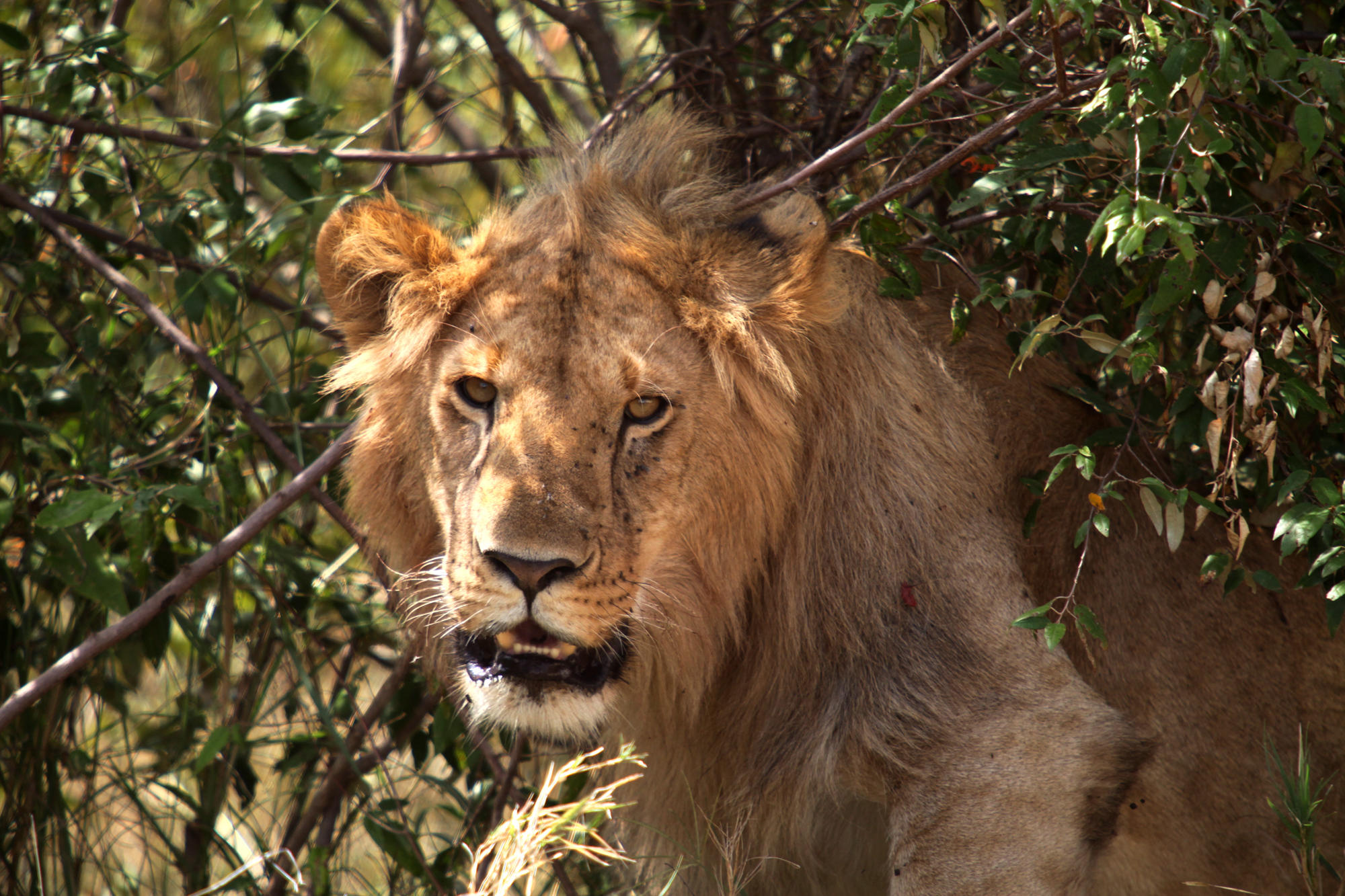 第一窝是在热气球降落点的附近,首先闯入眼帘的是一只半大的雄狮,如同进入青春期的男孩下巴开始有一层稀疏的胡须一样,它的脑袋上顶着一撮象征雄性身份的毛,这无疑是雄狮一生中最不上镜的一段时期。忽然,一对麦色的身影在另一从灌木的横斜交错的阴影中浮现出来,如此精湛的潜行能力,仿佛海豚灰色的鳍悄然划过破碎的海面。就在我们刚意识到两头母狮的存在时,树林一阵骚动,视线随之放低,一只小狮子轻快地小跑着奔向它的母亲。耳朵背上醒目的黑色和尾巴尖上的小黑点仿佛金色花丛中上下飞舞的蝴蝶,在高高的草丛中若隐若现。