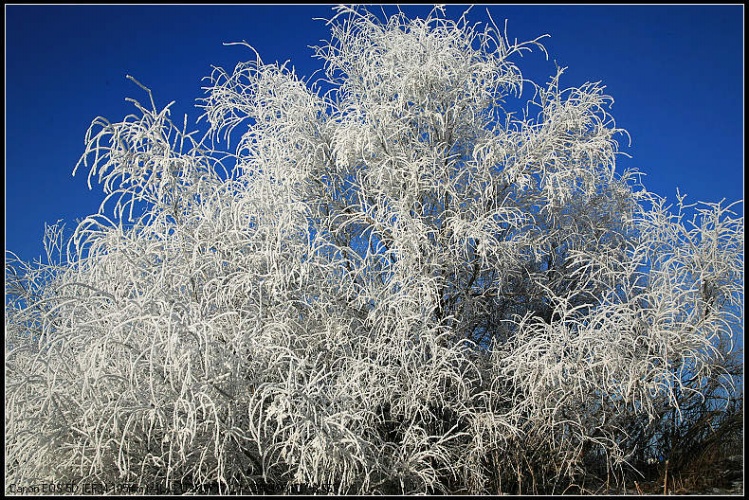 天气太冷了!短短一个钟头,厚厚的羽绒服就冻透了,冰冷刺骨,手和脚快要冻僵了,手指头麻木的按不动快门了,只好提前收兵。拍雾凇虽然辛苦,但拍到了想要的片子,欣赏到了难得一见的美丽雾凇,心中的那份愉悦无以言表。请分享我拍的一组雾凇景观。