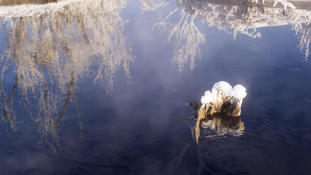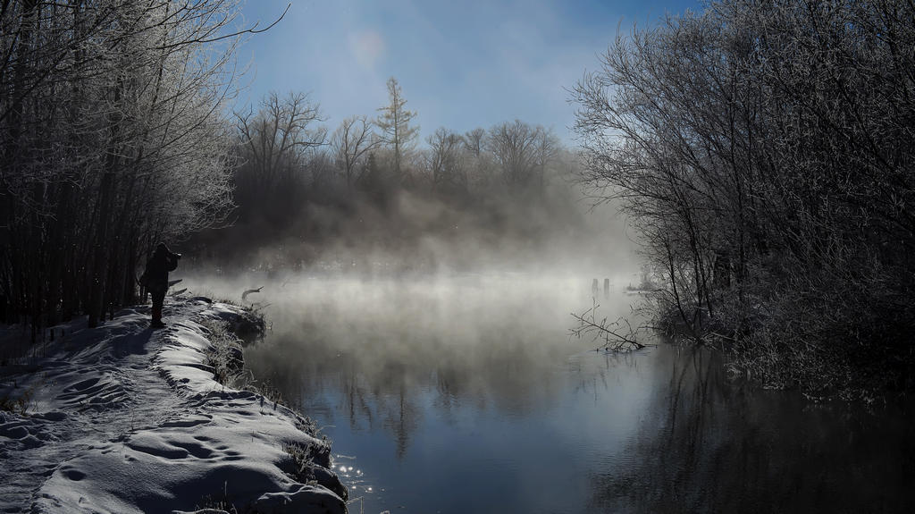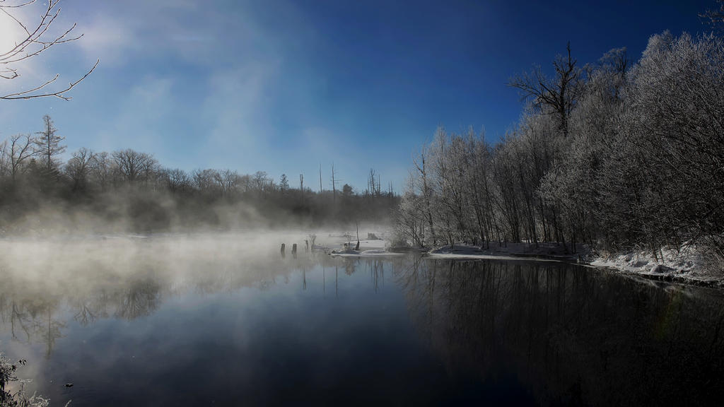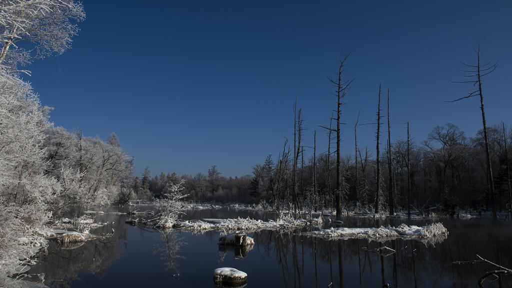 摄氏度以下时,这里就会出现雾凇和冰挂,而且雾气很大,氤氲缭绕,如仙境一般。清晨,水面或直立或横卧的枯树在浓浓的雾霭中若隐若现,呈现出种种令人惊异的魔幻般甚是有点诡异的景致。如果天气晴朗有日出的话,水面的枯树、岸边的雾淞与喷薄而出的红日和蒸腾飘渺的雾气交融在一起,便形成了一幅幅神奇魔幻、奇丽绝美的画面。立于岸边,置身其中,眺望远方,仿佛自己已远离了尘世,远离了喧嚣,走进了一个远古的神奇的魔幻世界。