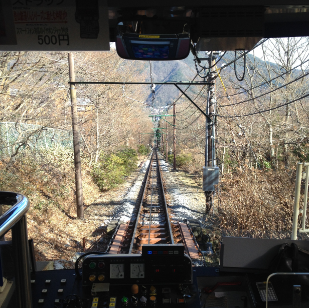 缆车站和登山电火车站就在一起,电火车倾斜着一路向下开,大约10分钟便到达 强罗
