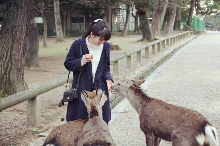 奈良的小鹿是不能随便喂吃的的,买了专门的小鹿饼干,150日元一包,买了5包赶紧藏在口袋里,不然被盯上了~那可是会被围攻的哦~