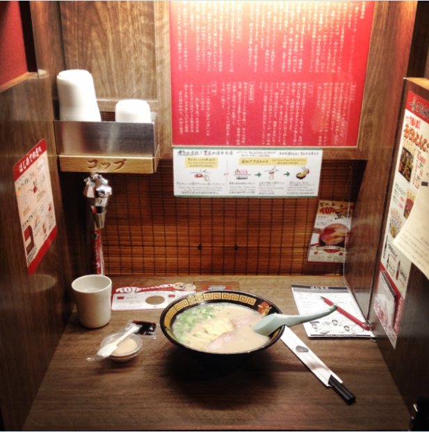 每人一个小隔间~入座后把喜好单放在桌上,按桌上的按键,卷帘后面就会有服务员来拿你的喜好单,做好后从小窗口端出来,盖上卷帘,就可以开吃啦~~~