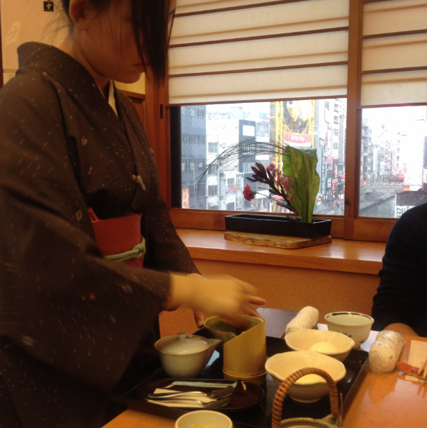桌上有提前放好的欢迎小纸条~穿和服的服务生踏着小步子送来抹茶和和果子,哈哈~好周到