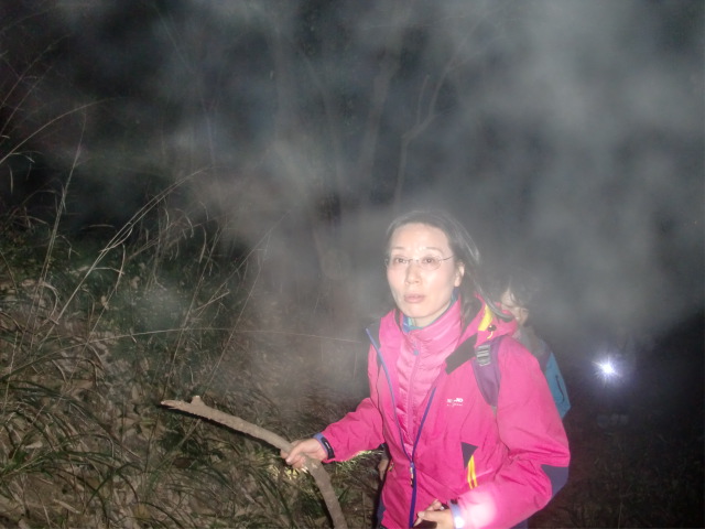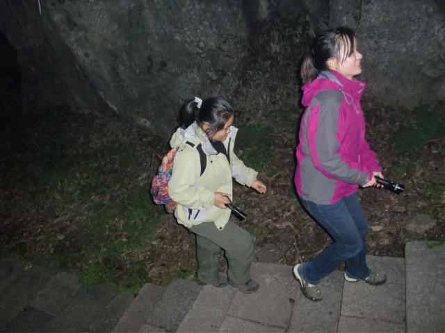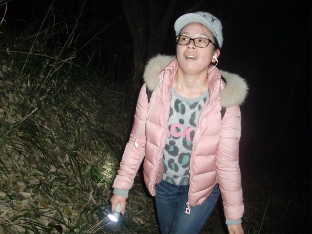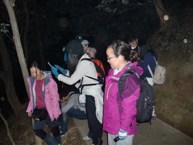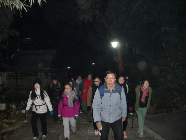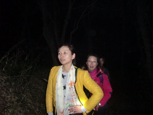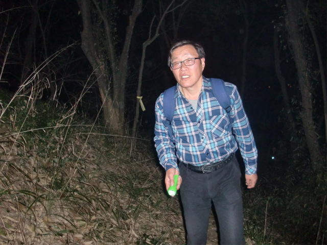 鉴于今天晚上到的人不是非常多,大概30左右,估摸着可以走得快些,所以,就考虑加些强度和难度。按计划从北观音洞台阶上山,没有走老路,而是从山腰直接转土路往老玉皇宫方向,这条土路印象中游侠客夜爬我还是第一次带,土路比较窄,队伍一字纵队前进。过了老玉皇宫后,往八卦田方向下,但不到底,过了慈云岭造像后,就往石龙洞造像方向转,然后从那边土路一直往将台山上,并不登将台山顶,山腰土路连穿,往凤凰山方向。中间在方向正确的情况下,还往上强穿了大约30米的野路。登顶凤凰亭后,从土路下到宋城路出。今天整条线路基本是土路为主,由于中间收队等候的时间还是有点长,所以走完全程已经超过了2个小时。