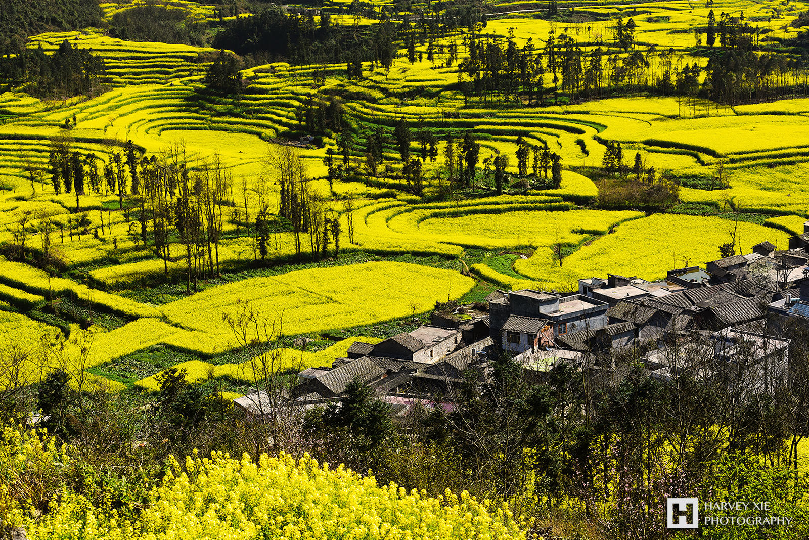 成畦成片的金黄色漫开来,淹没着田野村庄和房屋,潮湿的空气中飘满了花粉般质感的微尘,让人领略到高原花海的万种风情,把你的心情,把你的思绪,都染得金灿灿的。