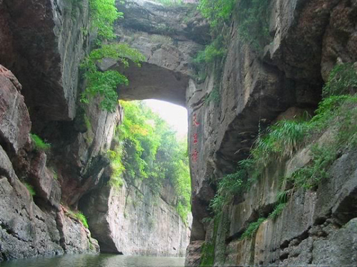 位于中甸县城东南10千米,呈东西流向的属都岗河从此穿越地下溶洞,形成一座天然的石灰岩桥梁。桥高60余米,宽10米,长约200米,桥面平坦笔直,颇似人工造就。步临桥上,奇中有险,两边峭壁如刀劈斧削。下至桥底,只见河水自南而北从洞中翻涌而出,洞中有一温泉,从岩壁中喷涌而出,与河水混为一流,冷热交替,雾气漫漫。