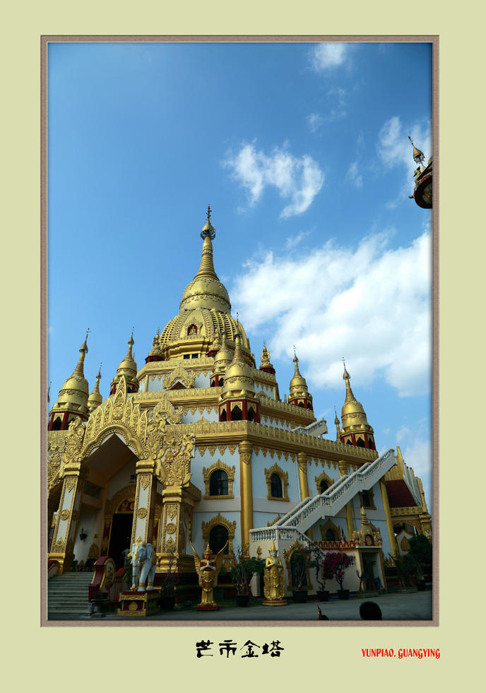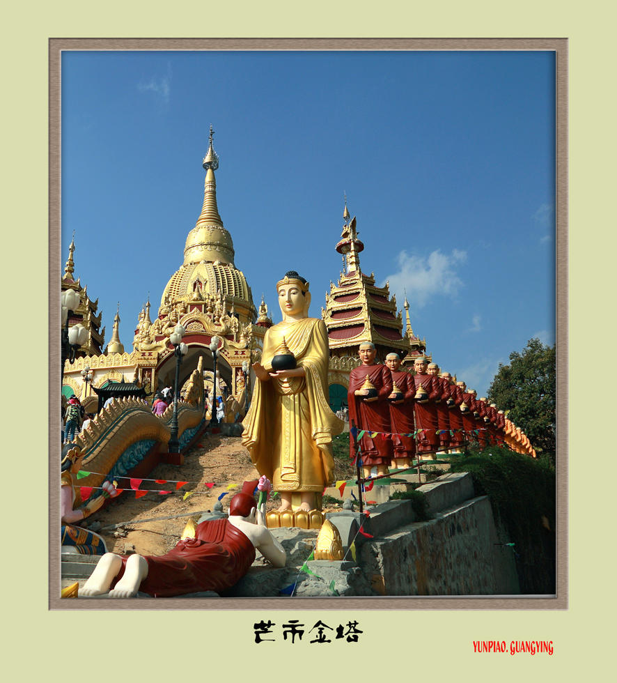 云南芒市的金塔以勐焕大金塔儿闻名,它座落在芒市东南部海拔一千零七十九点六米的雷牙让山顶。传说“释加牟尼”生前转世为金鸡[阿鸾]时曾生活于此地,佛涅槃后数百年,佛教弟子“召罕大”[阿罗汉]为传播佛祖教义亲临此山修炼,为“召罕大”有个修练的好环境,野草和荆棘全部让开,故称为雷牙让山,意为野草让开的地方,尔后在此山建一佛塔,自古以来是人们公认的佛教圣地之一。