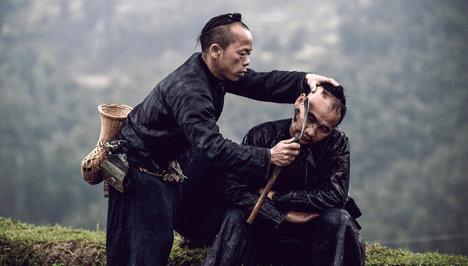 图中剃头的岜沙汉子是最早宣传岜沙时的形象代言人——滚元亮