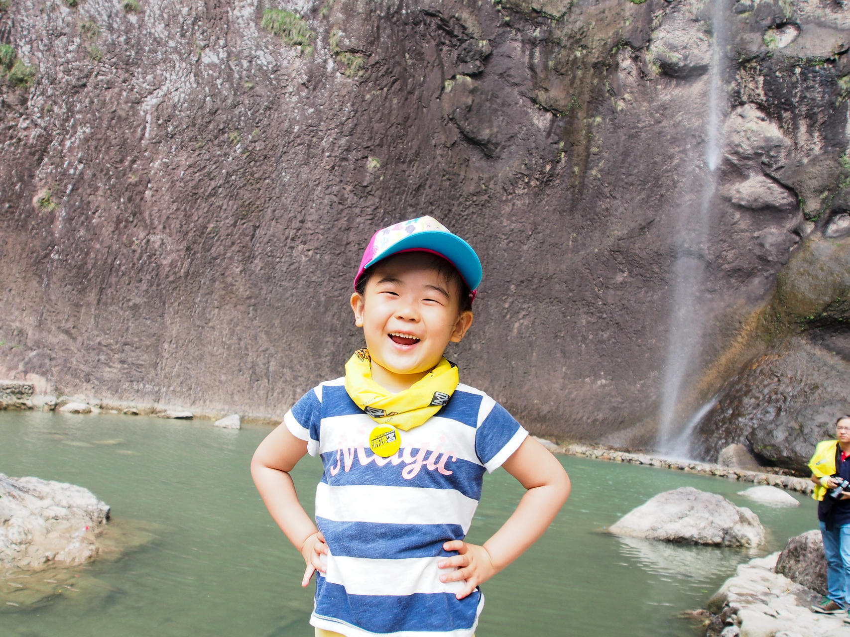 这是第二天在百丈瀑门口拍的集体照,百丈瀑本来是第一个景点,但是由于第一天在楠溪江堵车堵了很久,也耽误了后面的行程,所以把景点调到了第二天早上。