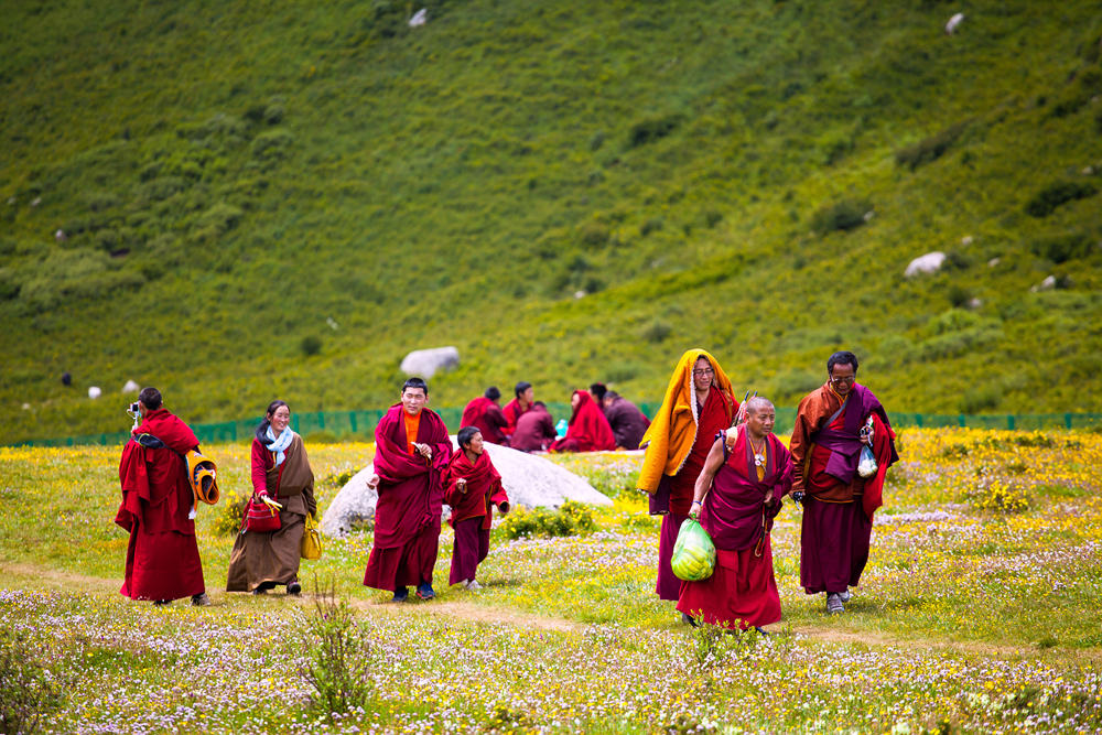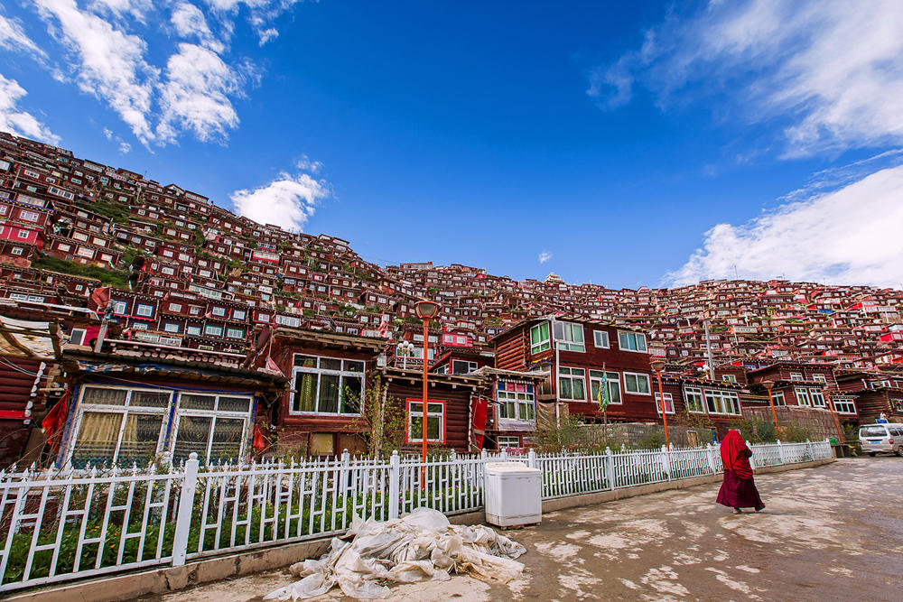 在川西色达县的喇荣沟,坐落着著名的“五明佛学院”,重重的群山环绕之中,沟里的僧舍,以佛学院的大经堂为中心,密密麻麻搭满了四面的山坡,不计其数的绛红色小木屋,延绵无数,一眼望不到头。这些红色小木屋,是数千名僧侣和尼姑的住所。置身山顶,只闻梵音袅袅,仙气弥漫,一时不知人间还是天堂。