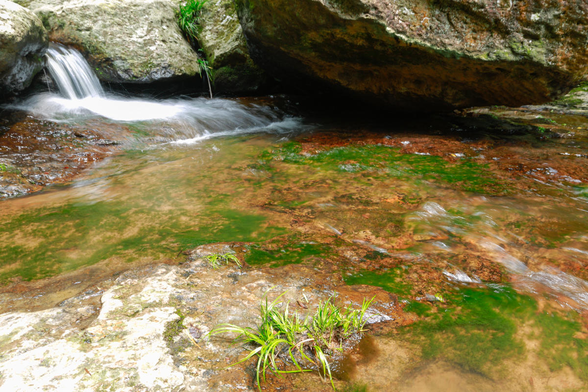 千丈幽谷和浙江常见的那种峡谷很不一样,是更为壮观的丹霞地貌。刚进入峡谷时,一条溪流将山谷分为两侧,两边各有一条小径可供行走,右侧小径沿山而建,左侧小径亲水而成。越往里走,谷外的青山逐渐被丹山所取代,高崖峭壁看起来即使拿去与三峡相比也毫不逊色,尤其在午后的阳光下,丹山的红、竹子的绿、树叶的黄,交错成一幅美丽的画面。