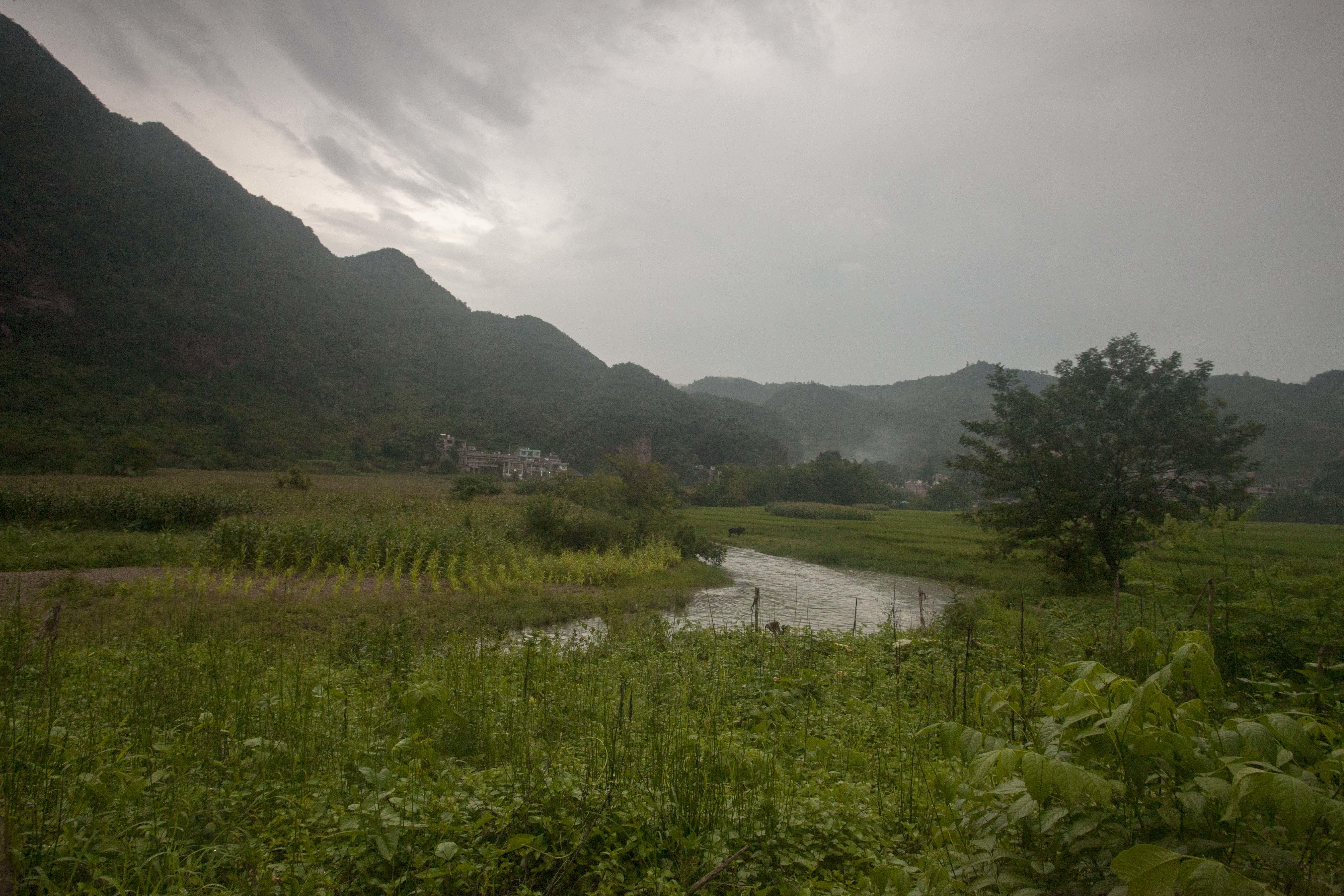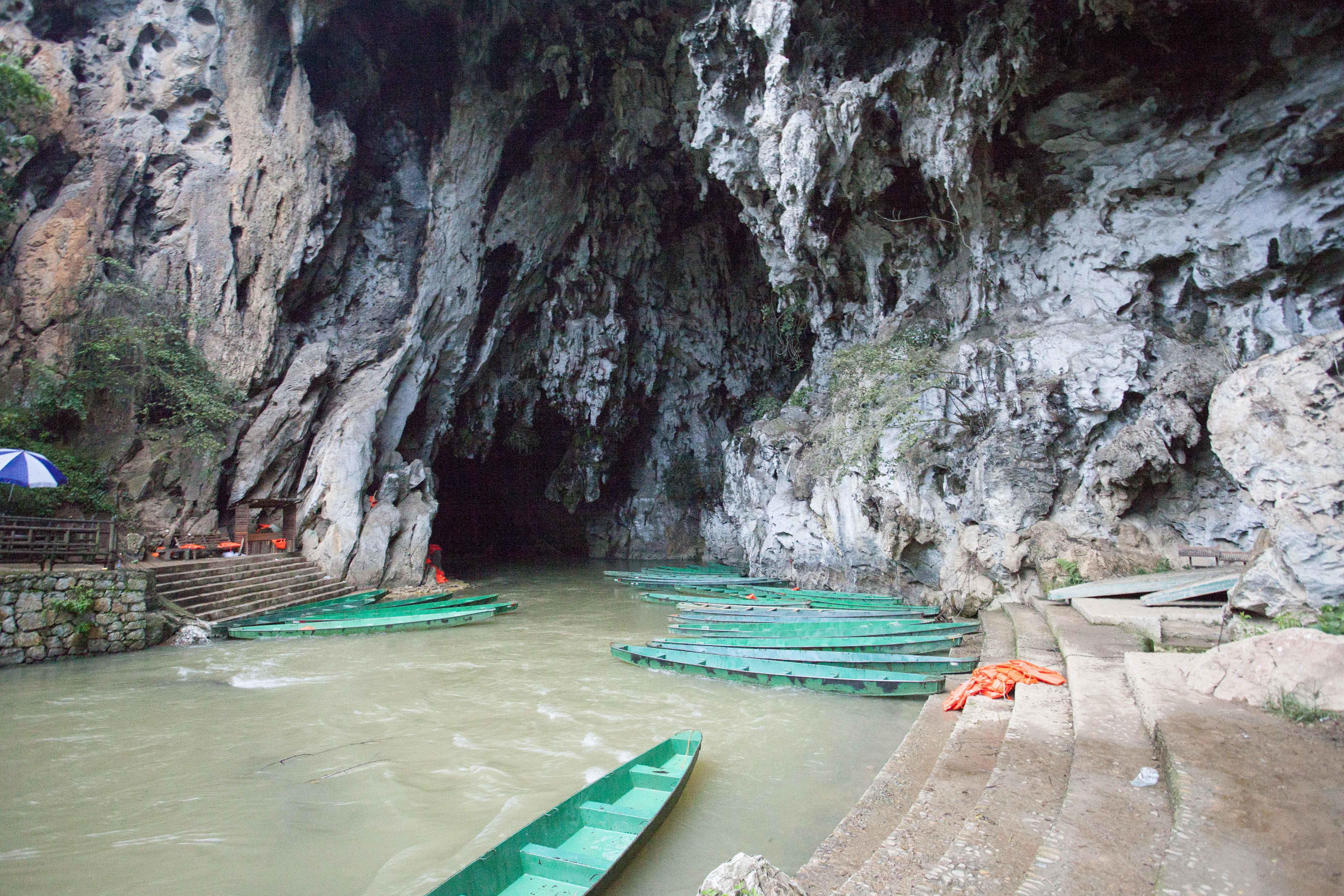 路终止在山脚下,河面顿时开阔了。寻着陶渊明的诗词,河流在溶洞的洞口穿行