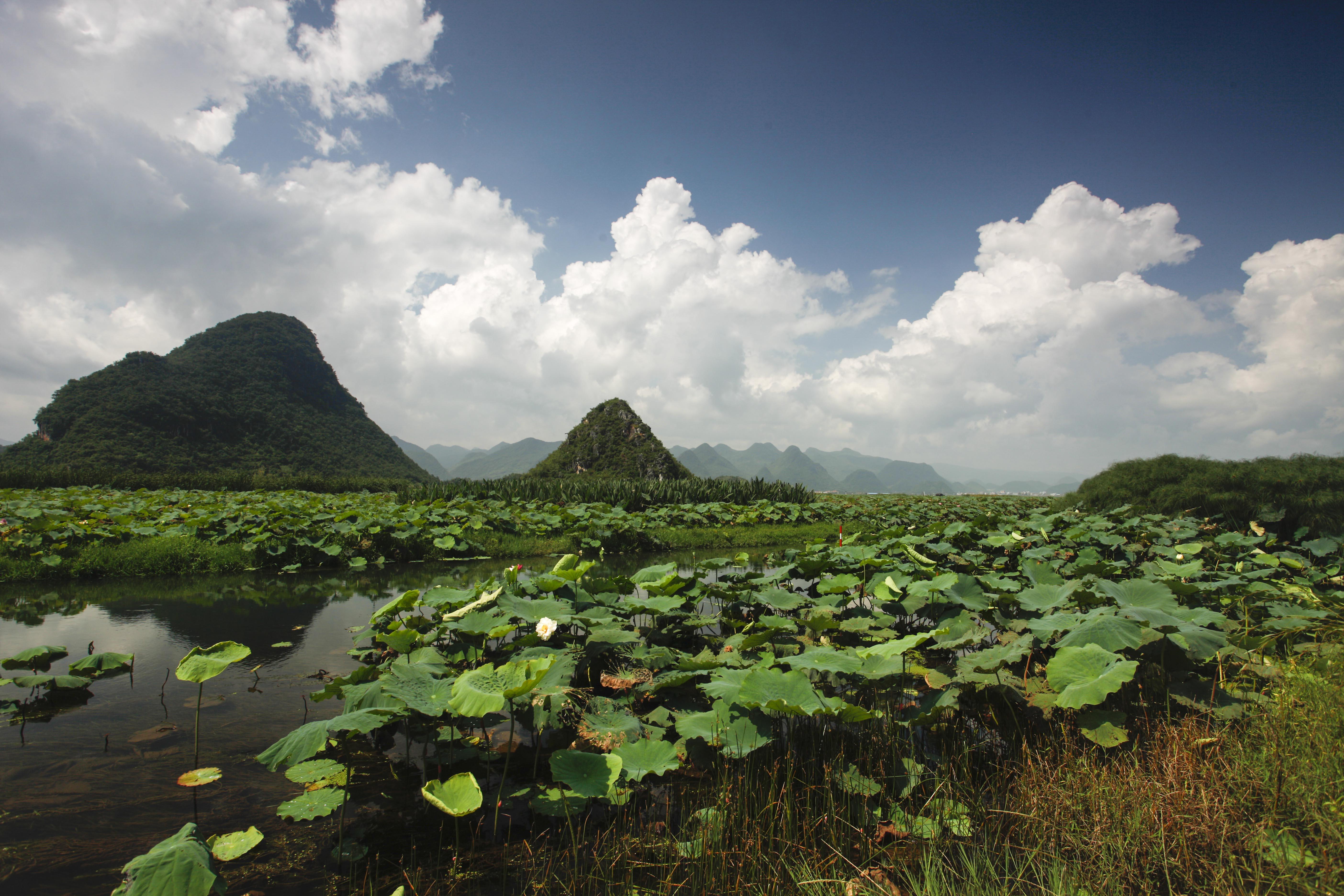 在滇东南的文山苗族壮族自治区,有一个盛满鱼虾的池塘,上天在这里塑造了万千峰林的同时,还将许多大小的湖泊洒落其间,小山丘、村落、湖泊星罗棋布,一点不亚于甲天下的桂林山水!择水而居的彝族人增添了这个地方的神奇,盛夏七八月,湖面万顷荷花相继争奇斗艳,早有蜻蜓立上头的尖尖角、含苞待放的新生命、怒放的出水芙蓉姿态万千。