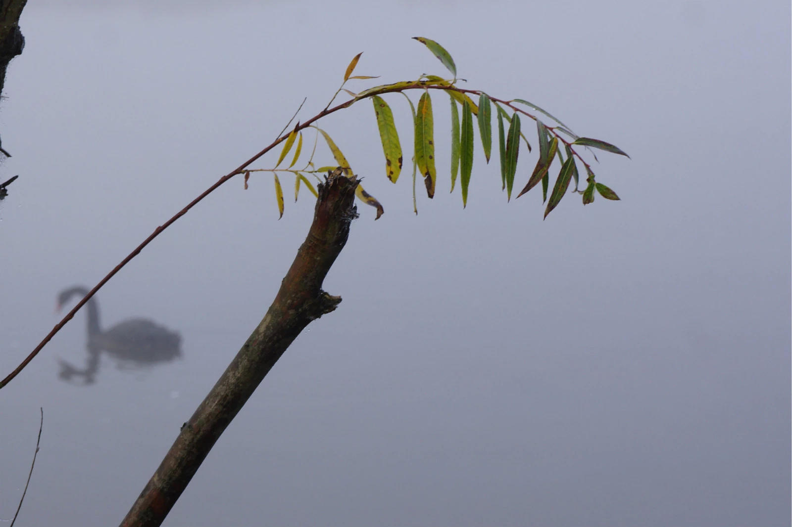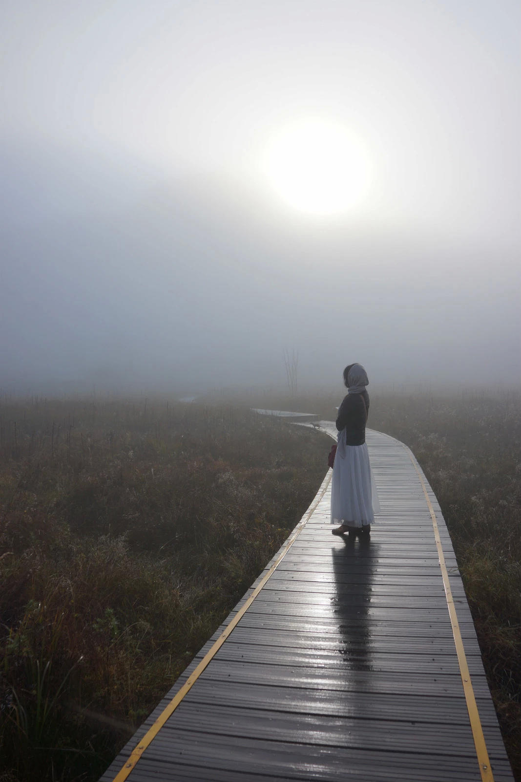 晨雾,一样缠绵、依旧缱绻,念着昨日黄昏时路过的帆、路过的天鹅湖,走进浓浓的雾气里、隐约的栈道上。