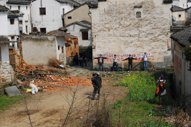 因为是地质灾害危险村,几位帅锅游侠勇敢的做起了人体路障