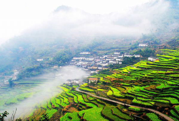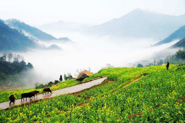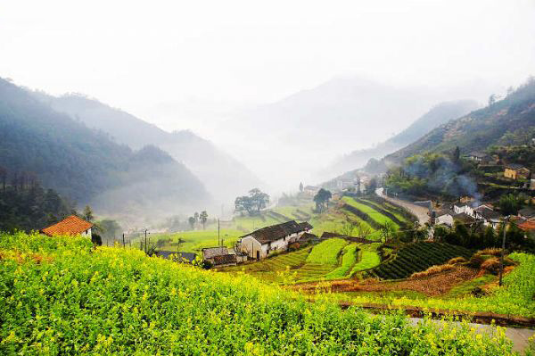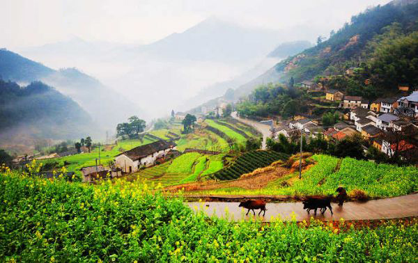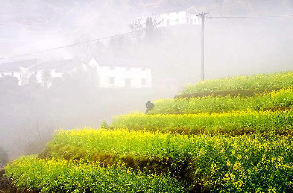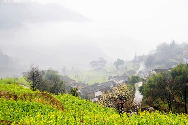 建德地处杭州—千岛湖—黄山这条黄金旅游线的中段,是国务院首批公布的44个重点风景旅游名胜区之一。全市辖27个乡镇,总面积2321平方公里,人口50万。 胥岭就在建德乾潭镇,离开乾潭镇还有十多公里路,盘山,不过大巴也可以开。是一个比较封闭的山村,还没有多少商品味。建议车可以开到山顶,人一路走下来,小路上梨花和油菜花相间。油菜花大约还有2周时间。据说秋季梯田的层层金色稻浪,景也不错。