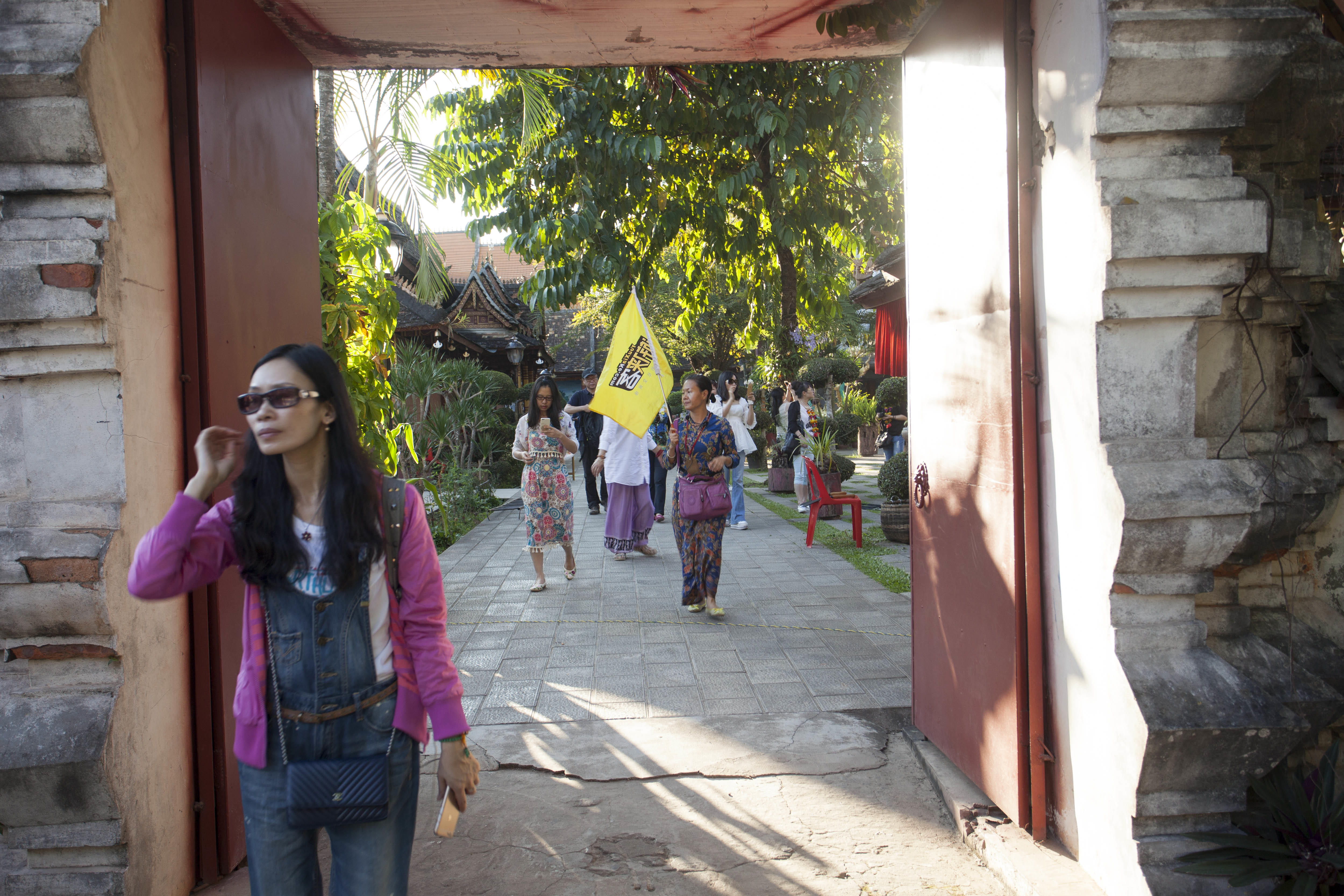 曼春满佛寺是傣族园里规模比较大的佛寺,寺门如同傣王的皇冠,精致、威严。步入这座佛教圣殿,眼前一片金碧辉煌,三头白象在法殿前用鼻子顶着四面佛。在这个全民信教的地方,当地人收入很大的一部分都捐献给了寺院,男孩子到了十多岁就要进入寺院修行了,不只是学习佛法,医疗、文化、艺术等很多很多类目都会在这里学习,更像是一所真正意义上的大学。当然,信仰也给予了他们力量。
