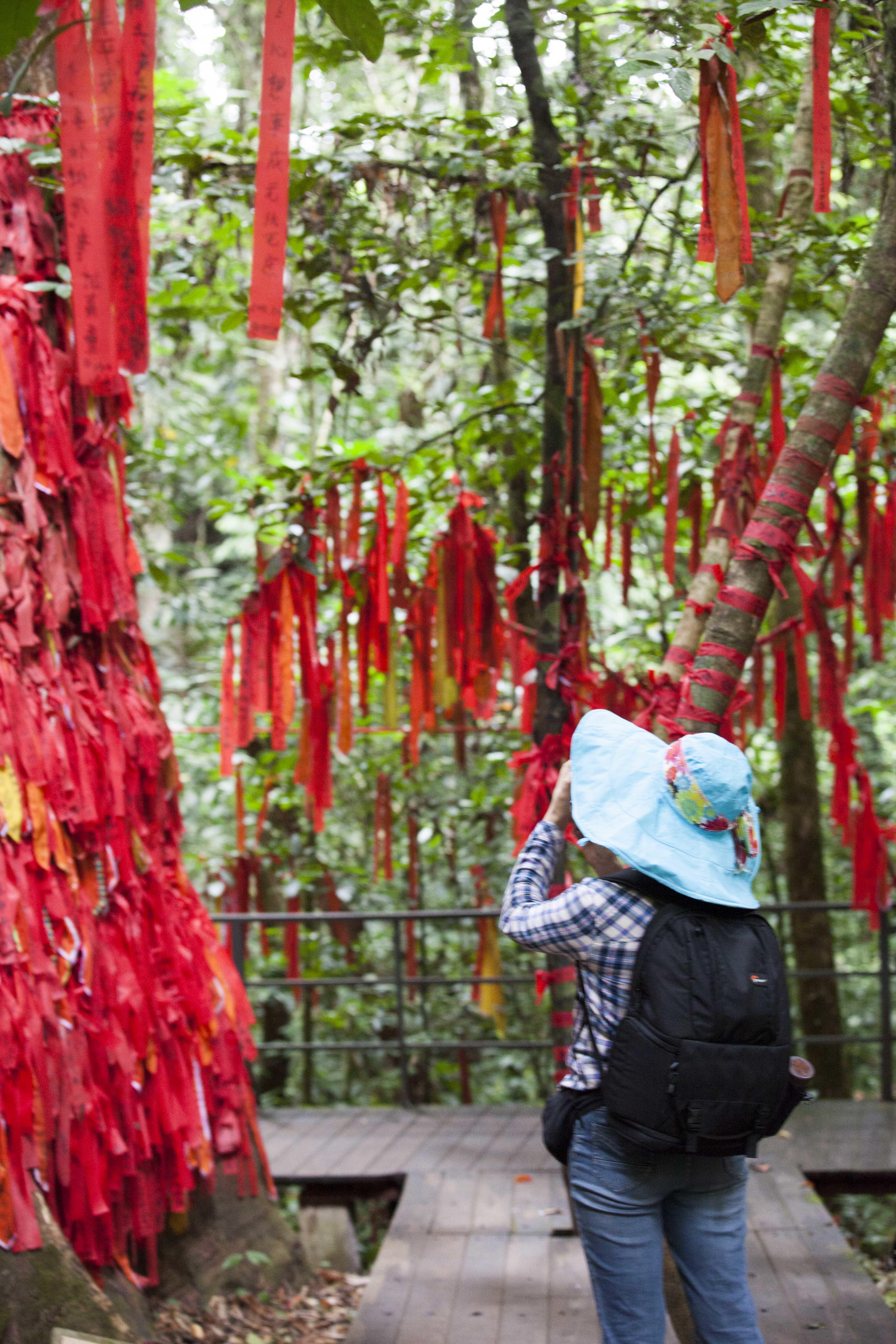午餐过后,游船驶过宽广平静的南腊河河面,两岸茂盛的热带植物逐渐变得茂盛,这里就是“望天树”了,作为热带的特有树种,平均高度有十多层楼高,最高的可达八九十米,向上望去,笔直的望天树直上云霄。如果身体允许,何不尝试下在高空丛林穿梭的感觉,三四十米的空中走廊贯穿于一片望天树之间,脚下就是茂密的热带丛林,有几段比较长的走廊颤颤巍巍,每走一步都如履薄冰,这种感觉是在地面上体会不到的。从空中走廊走下来,穿过一片热带原始森林,