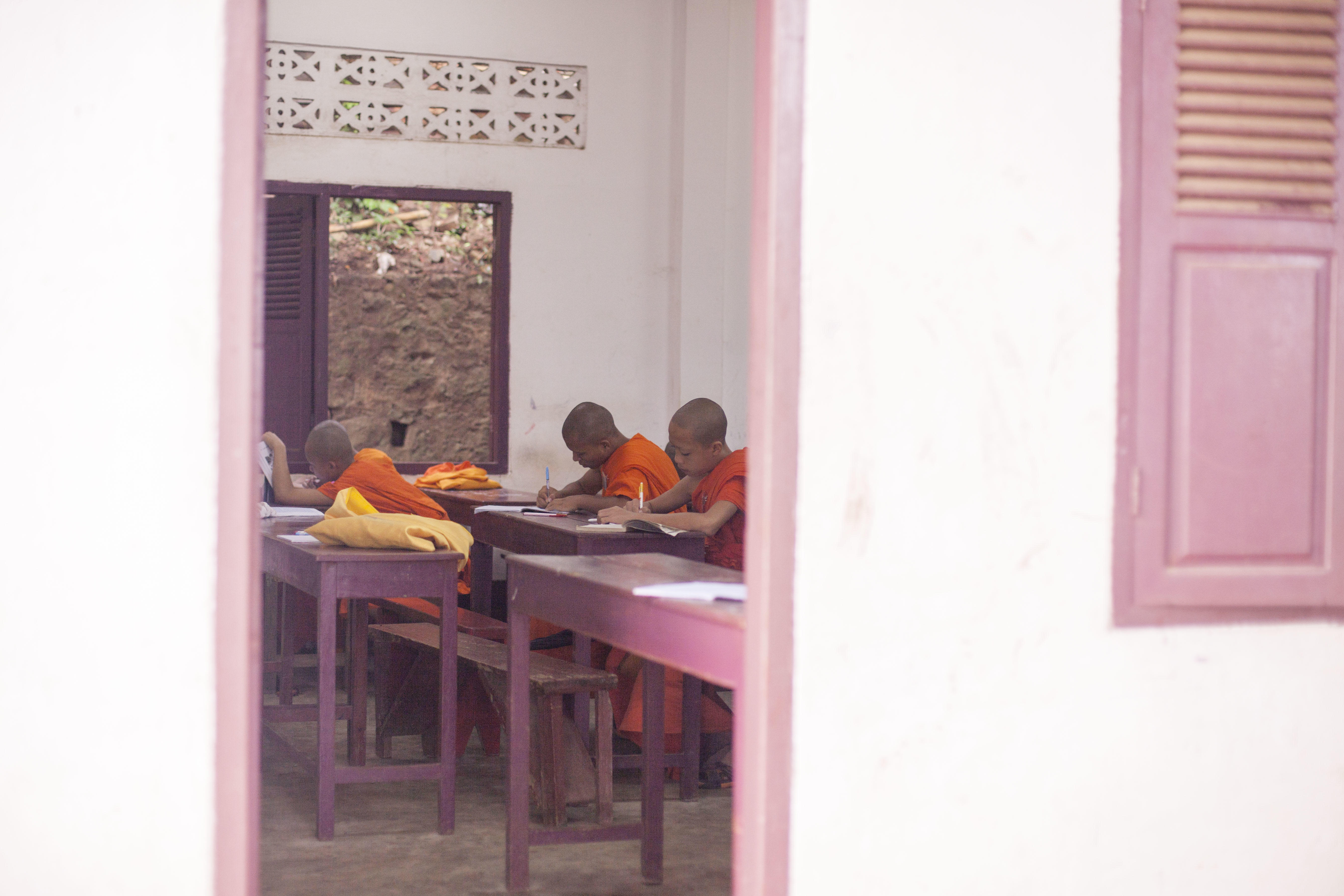 大皇宫位于普西山脚下,是1975年前君主立宪制时皇室贵族的居所,即便已时隔三十年,暗红的实木地板、高大的立式衣柜、以金银为主的生活器具以及礼乐、绘画孤本都不失当年的高贵典雅。接下来的时间去南康河旁的佛学院看看也是不错的选择,小沙弥还在上课,请尽量轻声细语!南康河的对岸别有一番天地,沿着临时搭建的木桥过河以后,穿过一小段村落,宁静的街道和娇艳的三角梅下坐着慵懒的狗,稀少的游客让这里更适合放松。