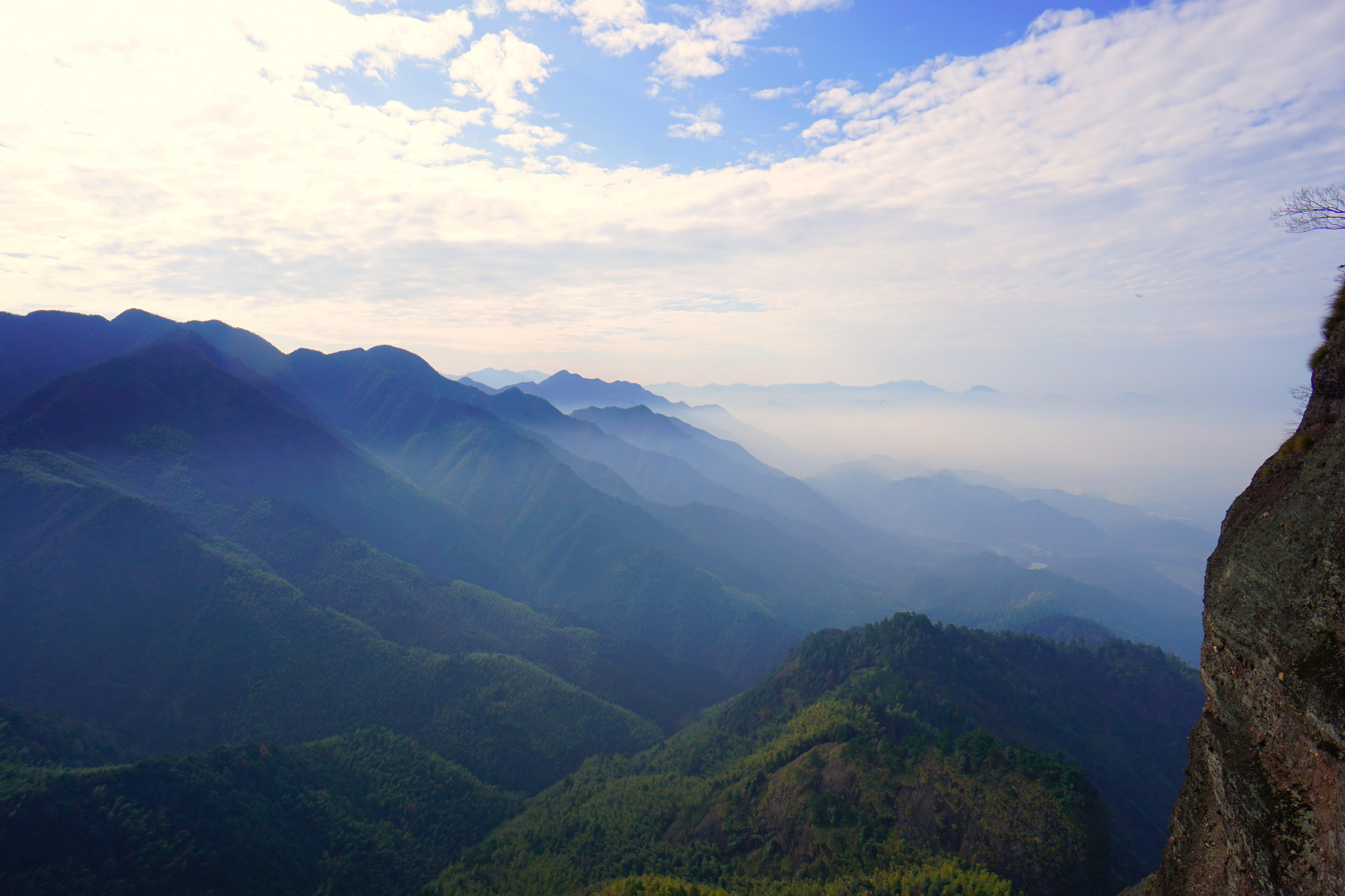 天柱山的潜山县到江郎山的江山市,旅途并不远,有高速公路相联,但由于行政分割的缘故,没有直达汽车,只能一点点往前倒腾。潜山县——安庆市——景德镇——婺源——常山——江山市。足足用了一天半时间,这可是上好的天气啊,都浪费在路上。到了江郎山景区,已经接近下午3点。工作人员劝说明儿再来,我想这个季节雾气弥漫是常态,难得有清晰的好天,进去拍个远景也好啊,说不定明天会有雾霾呢。第二天果然是雾气沉沉。天气现在成了旅游者要考虑的第一要素。