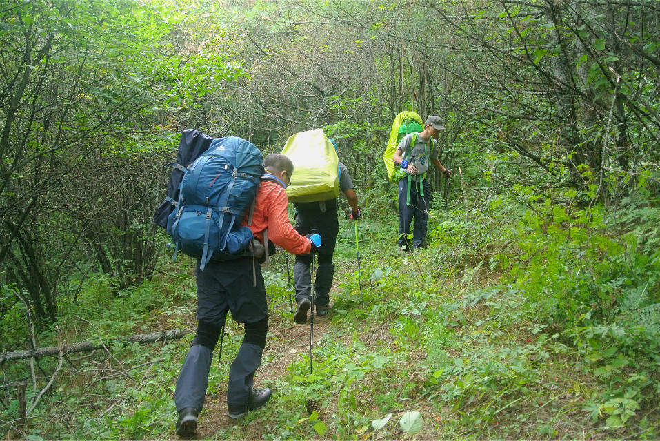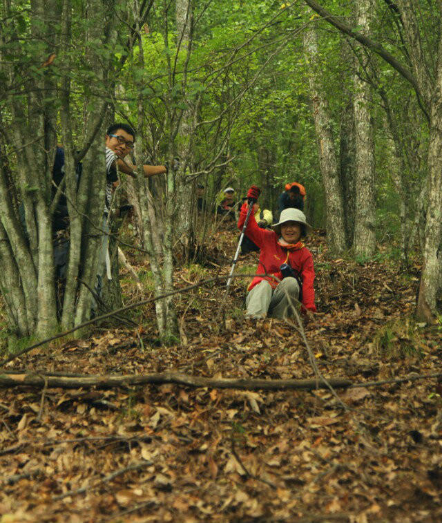 从红岩洞沿着贝母垭胡家堡的山脊向木鱼镇返回,开始还有一段草甸,然后就一直在丛林中穿行,虽说是下山但途中仍要翻越五座小的山峰,陡峭且险峻。路途布满了落叶,稍不留意就会滑倒,急速的高度下降伴随的是陡坡,有的超过
