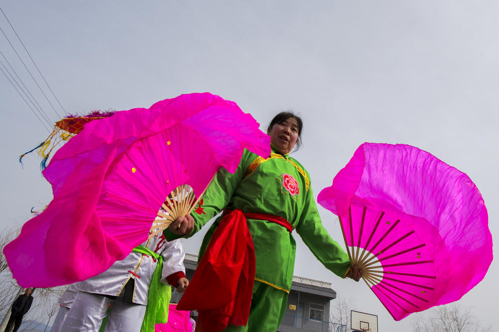 作前进、后退、左腾、右跃的走动。上下和谐,步调整齐,彩绸飞舞,彩扇翻腾,同时还可以伴随着唱。