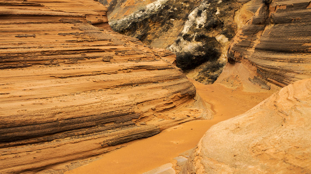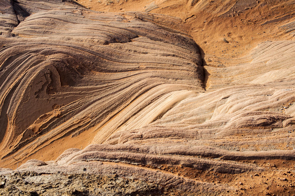 纤细的岩石纹路实际上是清楚地展示了沙丘沉积的运动过程。纹路的变化反映出每一层砂岩随着沉积矿物质的含量不同而产生的颜色深浅差异。红色主要是由铁和锰的氧化而产生,这些颜色不是一成不变的,往往在交错处和角落里形成更加复杂与抽象的图案。那些层层叠叠的石头就像一大批铺盖在地面上侵染过后晾晒的红色布匹,一层层、一卷卷、一盘盘在夕阳的渲染之下,异常的鲜红;又似黄土中冒出的一股红水缓慢的向低洼处流淌。