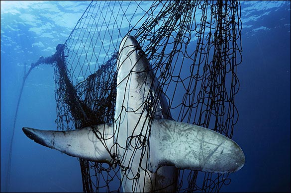 可恶的鱼翅:这张图是美国国家地理杂志摄影师布莱恩·斯克里在墨西哥加利福尼亚湾拍摄的,一条长尾鲨被困在刺网中。每年,这里大约有一亿条鲨鱼因此被杀死。