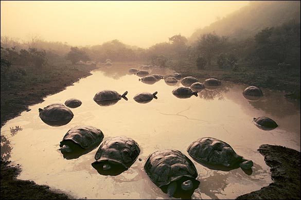 黎明的乌龟:弗兰斯·兰亭1984年在加拉帕戈斯群岛Alcedo火山池塘中拍摄到的,这些巨龟正沐浴在黎明的光辉中。在这个古老的群岛上,最大的本土动物就是这种巨龟,它们的寿命超过百岁,曾为达尔文的进化论提供灵感。它们很容易受到海盗和捕鲸人的猎杀,但这个Alcedo火山却与世隔绝,为巨龟提供了避难所。