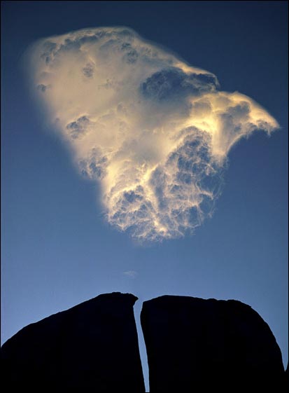 裂口和云:已故摄影师伽林·罗威尔1976年在美国加州内华达山脉东部拍摄的。罗威尔是照片合成技术的大师,他先将云彩和这道石头裂缝分别拍摄,然后组合而成。