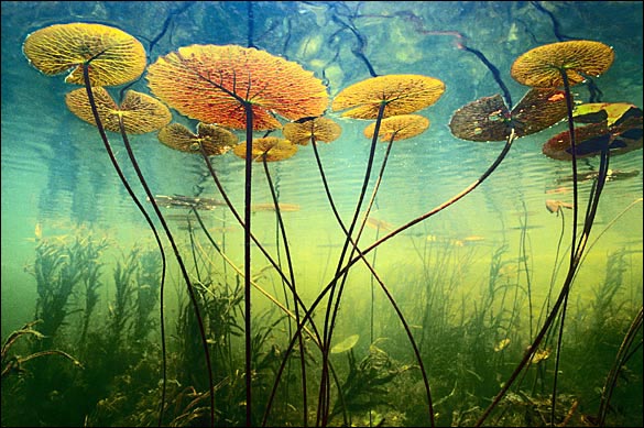 睡莲:兰亭在博茨瓦纳Okavango三角洲拍摄到的。这些睡莲代表了当地的湿地气候,它们覆盖住整个湖面,并为众多生命提供避难所。但是更令兰亭感到惊讶的是,水下的睡莲场景更美,尽管水只有几米深,但它们看起来好似顶到蓝天一样,显出无限的生命活力。