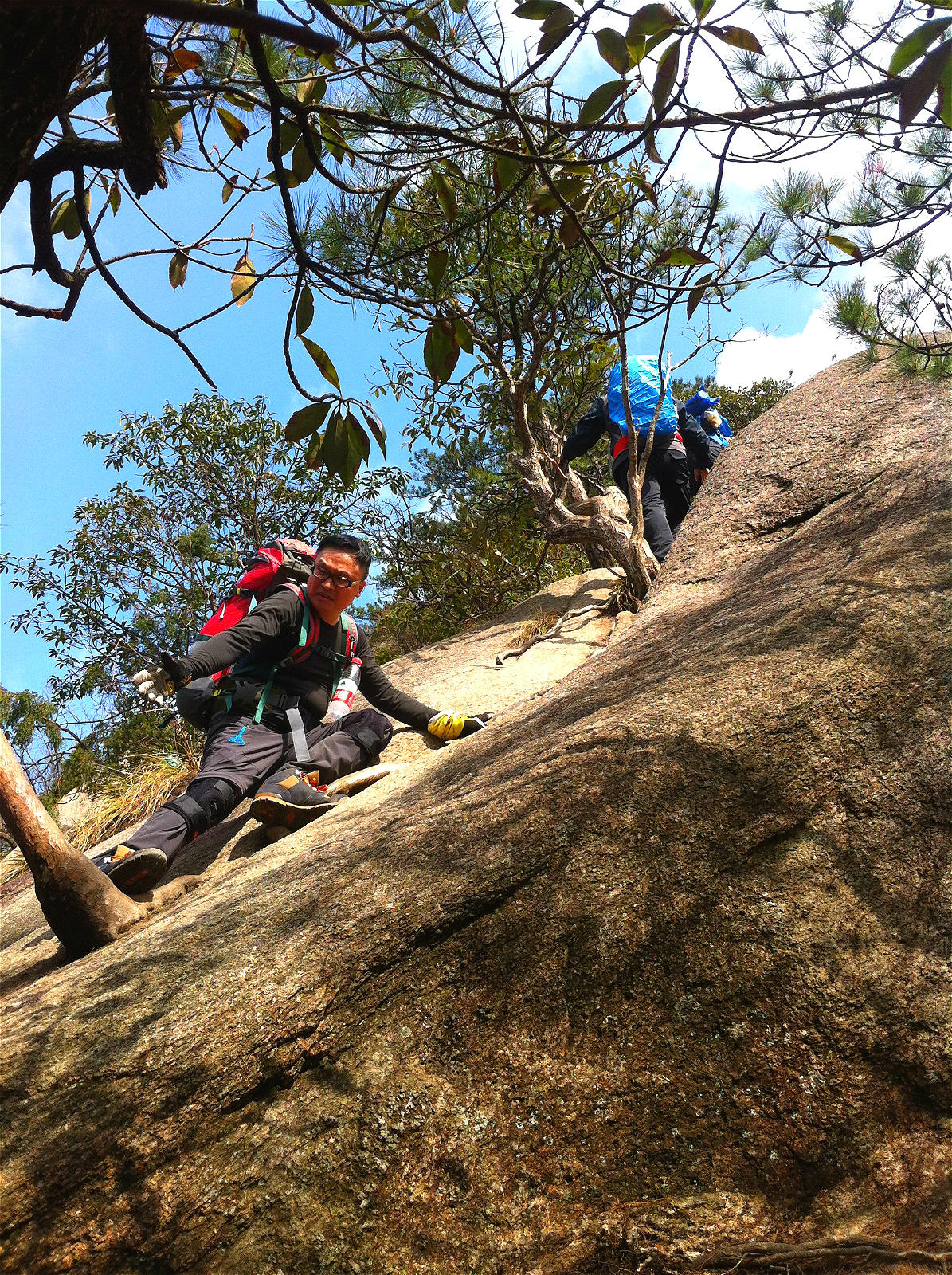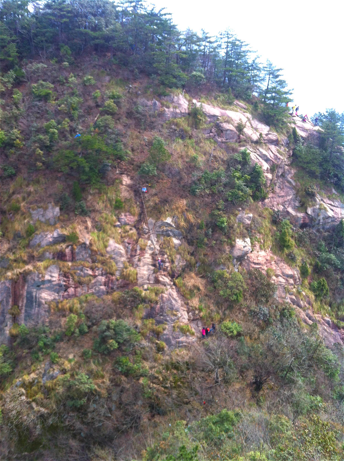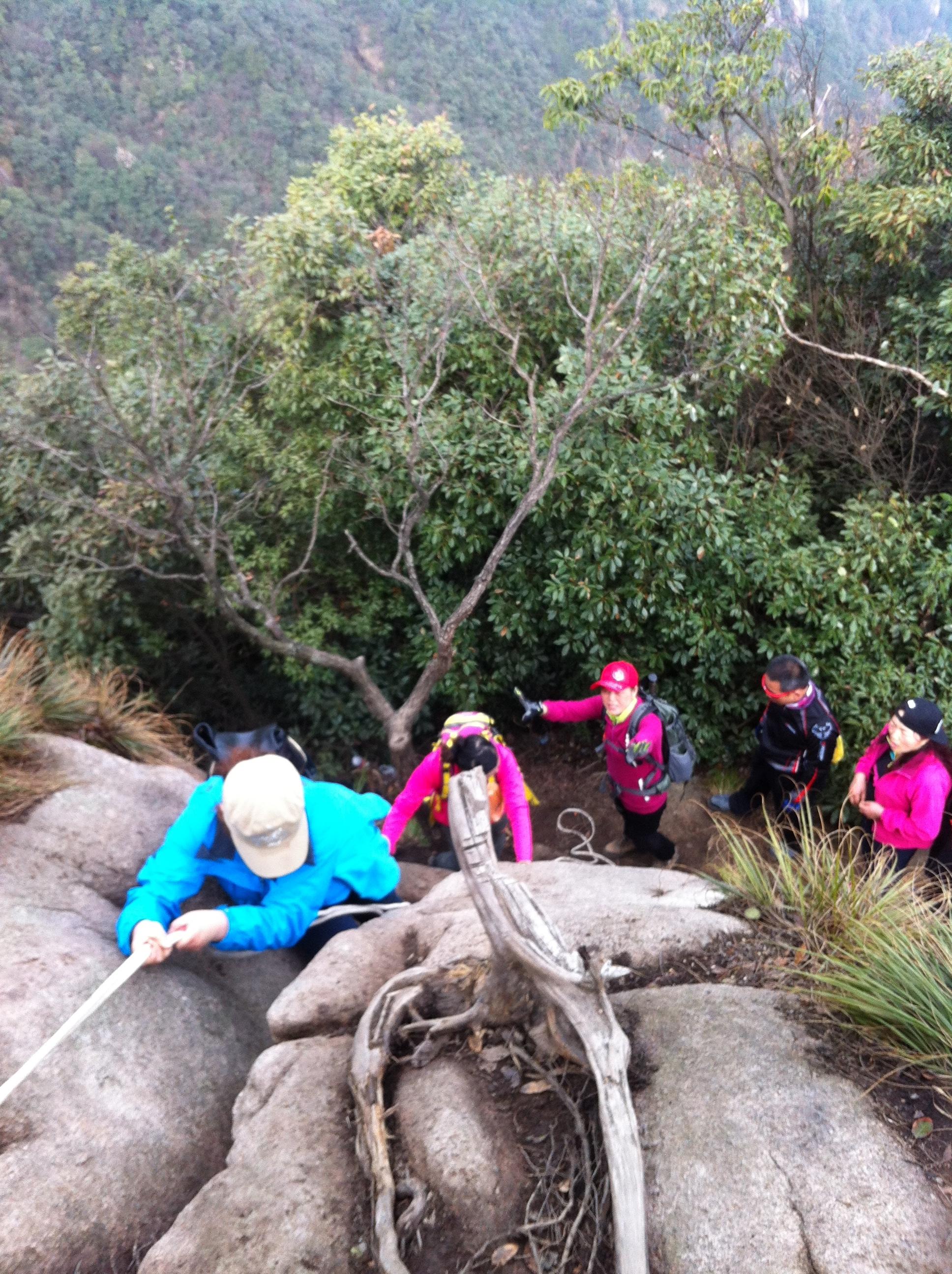 山脊上没有沙化的岩砂,但山势陡峭,有时是直上直下的岩壁,树木茂盛,很多地方需要借助绳索。